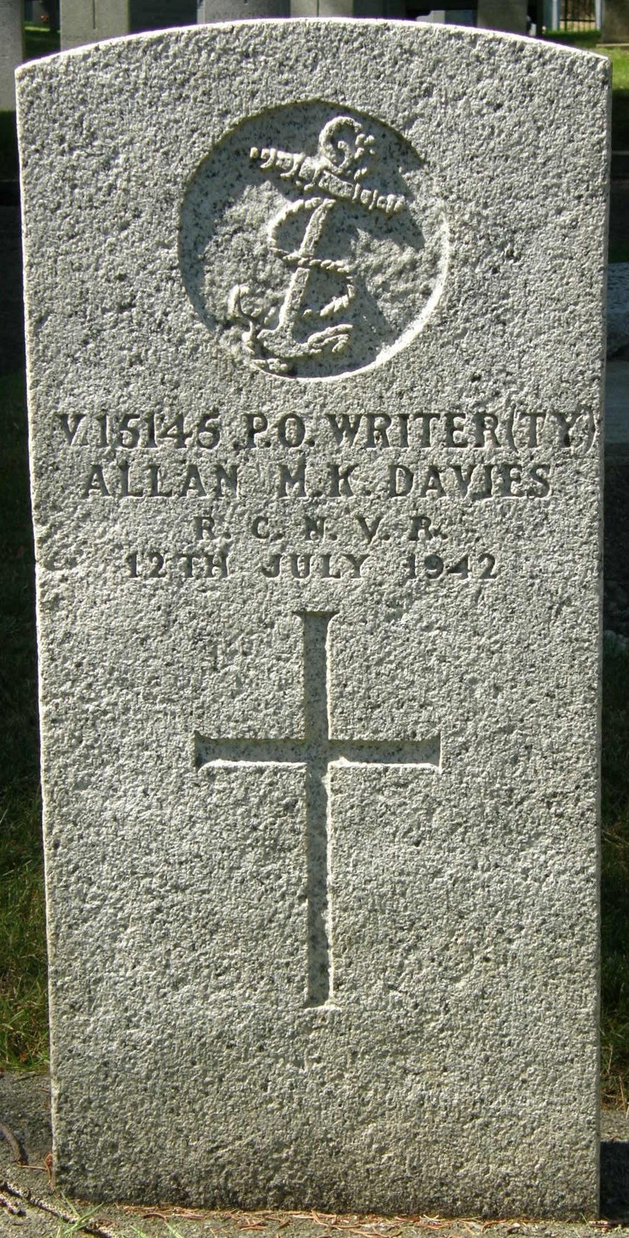 Petty Officer Writer A. M. K. Davies accidentally drowned at Lost Lake, British Columbia, while on weekend leave. He is buried in the Veterans Cemetery, Esquimalt, British Columbia.