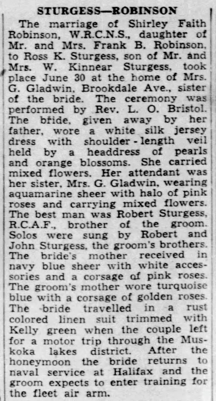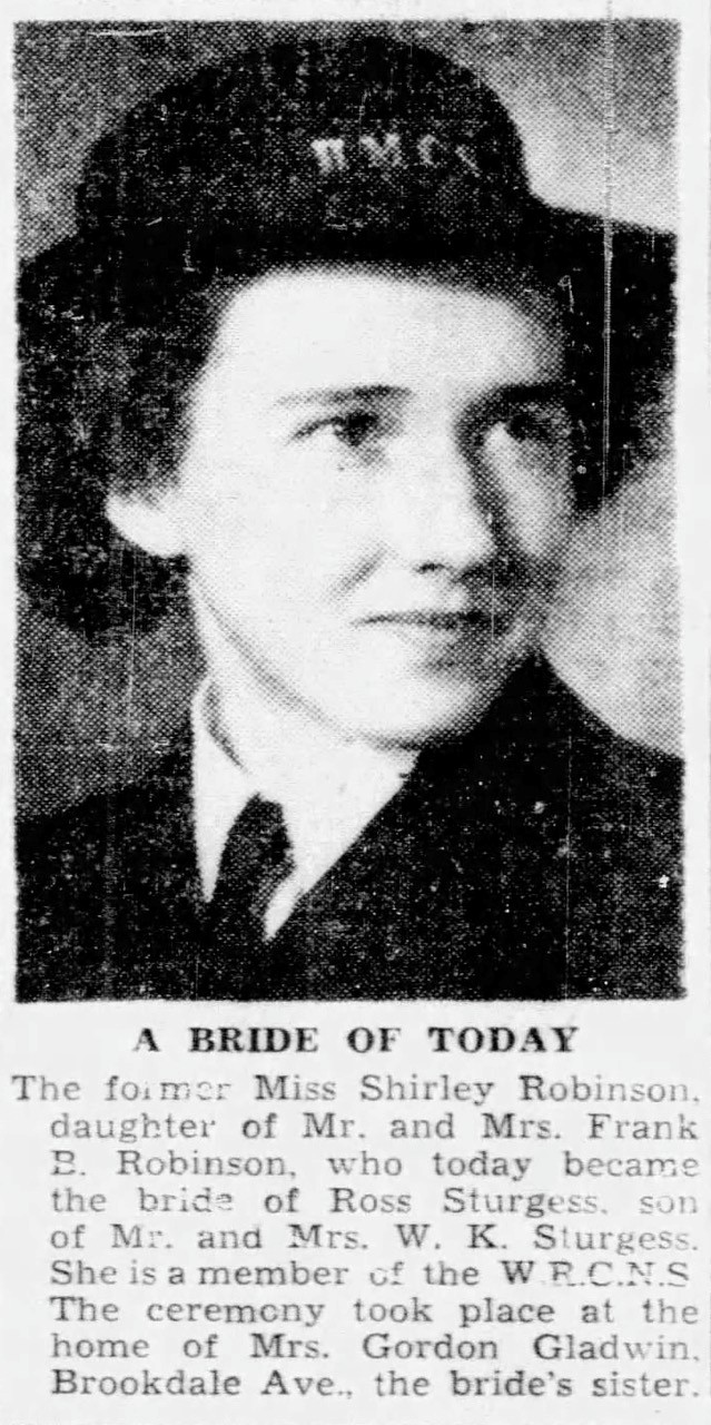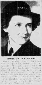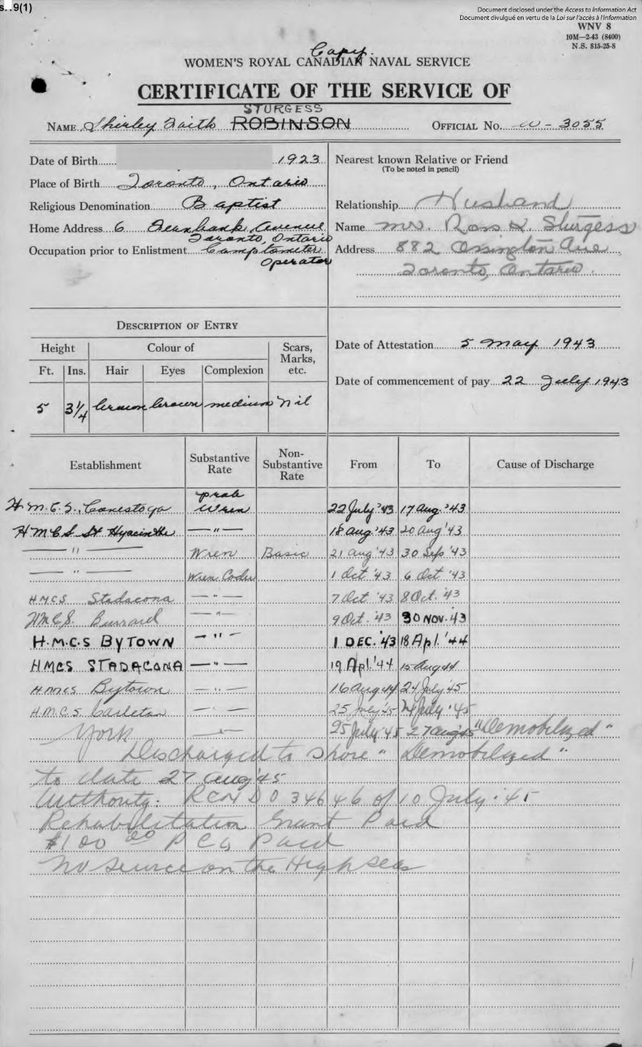 Ships served in: HMCS YORK - Enlisted 05 May 1943 * Commenced Active Service 22 Jul 1943 as a Probationary Wren, WRCNS HMCS CONESTOGA - Drafted to CONESTOGA 22 Jul 1943 HMCS ST HYACINTHE - Drafted to ST HYACINTHE 18 Aug 1943 * Rated Wren, WRCNS 21 Aug 1943 * Rated Wren Coder, WRCNS 01 Oct 1943 HMCS STADACONA - Drafted to STADACONA 07 Oct 1943 HMCS BURRARD - Drafted to BURRARD 09 Oct 1943 HMCS BYTOWN - Drafted to BYTOWN 01 Dec 1943 HMCS STADACONA - Drafted to STADACONA 19 Apr 1944 HMCS BYTOWN - Drafted to BYTOWN 16 Aug 1944 HMCS CARLETON - Drafted to CARLETON 25 Jun 1945 HMCS YORK - Drafted to YORK 25 Jul 1945 * Demobilized 27 Aug 1945