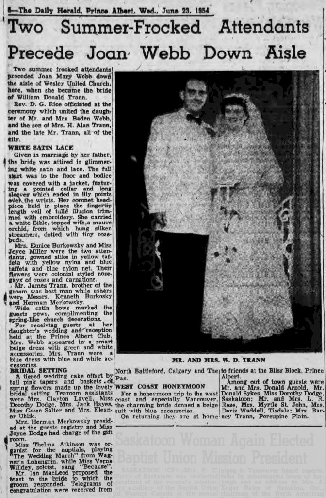 Article from The Daily Herald, Prince Albert, Wed., April 28, 1954 - Mr. and Mrs. Baden Webb are pleased to announce the engagement of their only daughter, Joan Mary, to William Donald Trann, youngest son of Mrs. A. Trann and the late Mr. H. A. Trann. The Wedding will take place 19th May, 1954, at 2 p.m. at the Wesley United Church, Prince Albert.