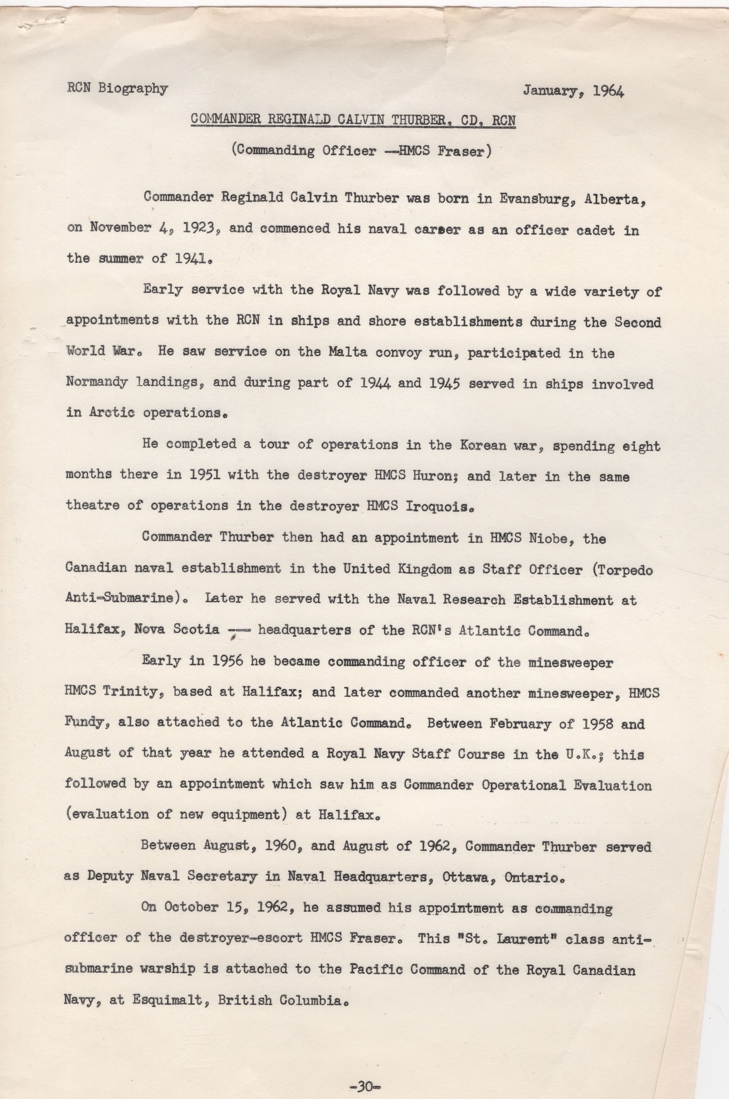 Ships served in: HMCS HURON - Appointed to HURON 03 Jul 1950 as a Lt (TAS), RCN. Korean War service HMCS IROQUOIS - Korean War HMCS NIOBE - as Staff Officer (Torpedo Anti-Submarine) HMCS TRINITY - Appointed to TRINITY 11 May 1956 as Commanding Officer HMCS FUNDY - Appointed to FUNDY 18 Dec 1956 as Commanding Officer HMCS FRASER - Appointed to FRASER 03 Oct 1962 as Commanding Officer. Note: Cdr Thurber's bio states he was appointed to Fraser 15 Oct 1962, however the Navy List show him as assuming command on 03 Oct 1962.