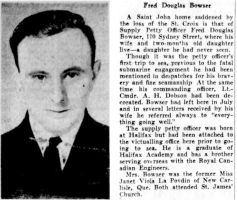 BOWSER, Fred Douglas, Supply PO, V25717, RCNVR, MPK - 20 Sep 1943, HMCS ST CROIX - Son of Louis Herman Bowser and Egolda Enid Bowser, of Kentville, Nova Scotia; husband of Janet Viola Bowser, of Saint John, New Brunswick.