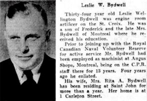 BYDWELL, Leslie Wellington, ERA, V25270, RCNVR, MPK - 20 Sep 1943, HMCS ST CROIX - Son of Frederick and Alice Bydwell, of Montreal, Province of Quebec; husband of Rita Annette Bydwell, of Saint John, New Brunswick.
