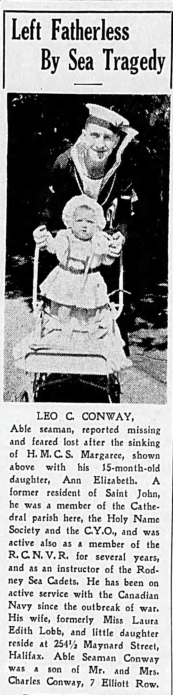CONWAY, Leo Charles, AB, V2215, RCNVR, MPK - 22 Oct 1940, HMCS MARGAREE - Son of Charles A. and Mary Conway, of Saint John, New Brunswick; husband of Laura Edith Conway, of Saint John.