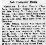 RISING, Jack Humphrey, OA 4c, V26493, RCNVR, MPK - 20 Sep 1943, HMCS ST CROIX - Son of Bessie Rising, of Moncton, New Brunswick; husband of Inez Dorothy Rising, of Moncton.