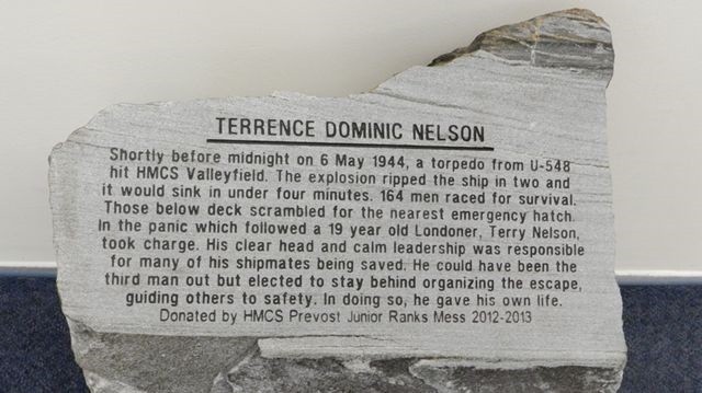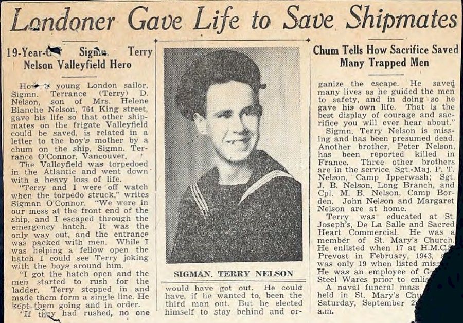 Londoner Gave Life to Save Shipmates - Chum Tells How Sacrifice Saved Many Trapped Men. How a young London sailor Signalman Terrance (Terry) D. Nelson gave his life so that other shipmates on the frigate Valleyfield could be saved is related in a letter to the boy's mother by a fellow sailor who survived the loss of Valleyfield Signalman Terrance O'Connor of Vancouver. The Valleyfield was torpedoed in the Atlantic and went down with a heavy loss of life. "Terry and I were off watch when the torpedo struck" writes Signalman O'Connor. We were in our mess at the front end of the ship and I escaped through the emergency hatch. It was the only way out and the entrance was packed with men. While I was helping a fellow crew member to open the hatch, I could see Terry joking with the boys around him. I got the hatch open and the men started to rush for the ladder. Terry stepped in and made them form a single line. He kept them going and in order. If they had rushed, no-one would have got out. He could have, if he wanted to be the third man out, but he elected to stay behind and organize the escape. He saved many lives as he guided the men to safety, and in doing so he gave his own life. That is the best display of courage and sacrifice you will ever hear about. Signalman Terry Nelson is missing and has been presumed dead. Another brother, Peter Nelson, has been reported killed in France. Three other brothers are in the service, Sgt.-Maj. P. T. Nelson, Camp Ipperwash: Sgt. J. B. Nelson, Long Branch, and Cpl. M. B. Nelson, Camp Borden. John Nelson and Margaret Nelson are at home. Terry was educated at St. Joseph's De La Salle and Sacred Heart Commercial. He was a member of St. Mary's Church. He enlisted at the age of 17 at H.M.C.S. Prevost on February 03, 1943.