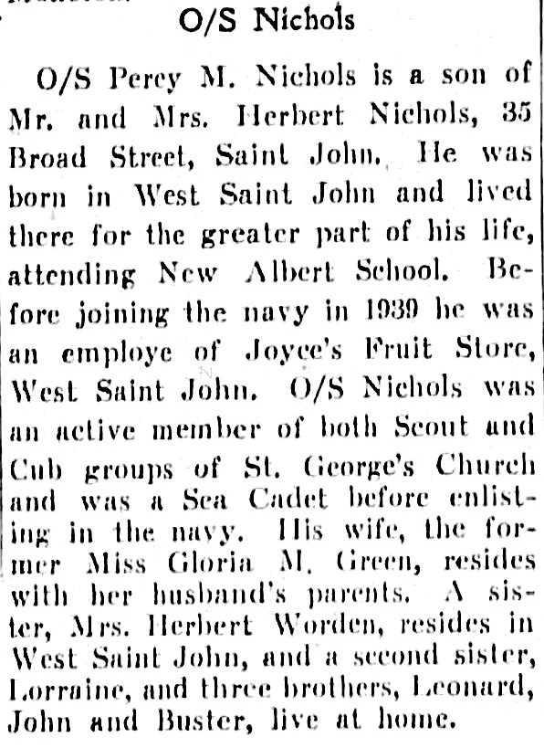 NICHOLS, Percy Merrill, AB, V2299, RCNVR MPK - 07 May 1944, HMCS VALLEYFIELD - Son of John Herbert and Inez Gertrude Nichols, of Saint John, New Brunswick; husband of Gloria Mary Nichols, of Saint John.