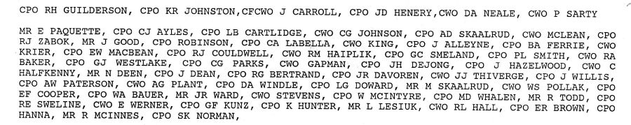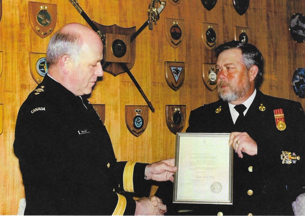 Ships served in: HMCS NONSUCH - Enlisted 29 Nov 1955 HMCS NEW WATERFORD - Served in NEW WATERFORD in 1965 as a Leading Seaman Engineering Mechanic NDHQ OTTAWA FLEET MAINTENANCE GROUP (Pacific) MANADON COLLEGE, Plymouth, England, UK - Naval Engineering Instructor. He recounted that one of his officer students asked him what university he went to. He replied "Edmonton High School, Grade 9." * Honourably Released 19 Nov 1993