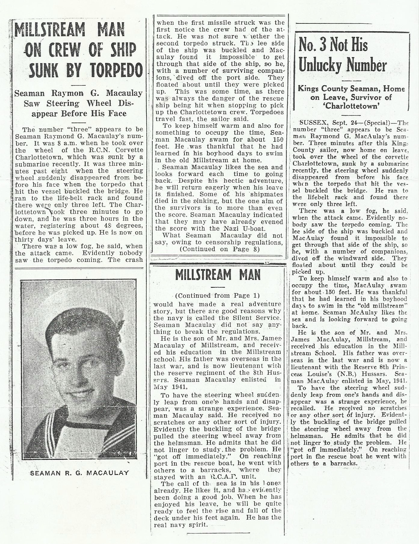 (below) Articles on Seaman Raymond MacAulay surviving the sinking of HMCS CHARLOTTETOWN K244 Courtesy of the Saskatoon Museum of Military Artifacts