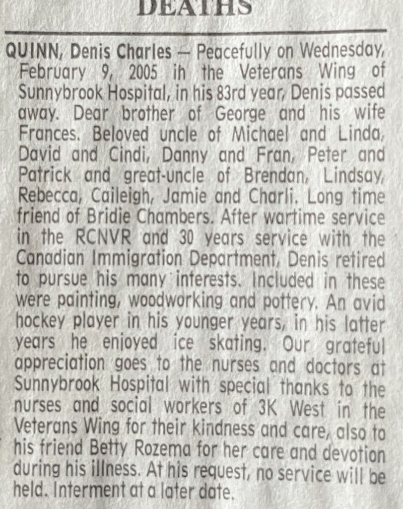 QUINN, Denis Charles - Peacefully on Wednesday, February 9, 2005 in the Veterans Wing of Sunnybrook Hospital, in his 83rd year, Denis passed away. Dear brother of George and his wife Frances. Beloved uncle of Michael and Linda, David and Cindi, Danny and Fran, Peter and Patrick and great-uncle of Brendan, Lindsay, Rebecca, Caileigh, Jamie and Charlie. Long time friend of Bridie Chambers. After wartime service in the RCNVR and 30 years service with the Canadian Immigration Department. Denis retired to pursue his many interests. Included in these were painting, woodworking and pottery. An avid hockey player n his younger years, in his latter years he enjoyed ice skating. Our grateful appreciation goes to the nurses and doctors at Sunnybrook Hospital with special thanks to the nurses and social workers of 3K West in the Veterans Wing for their kindness and care, also to his friend Betty Rozema for her care and devotion during his illness. At his request, no service will be held. Interment at a later date. (Click here to view to published obituary)