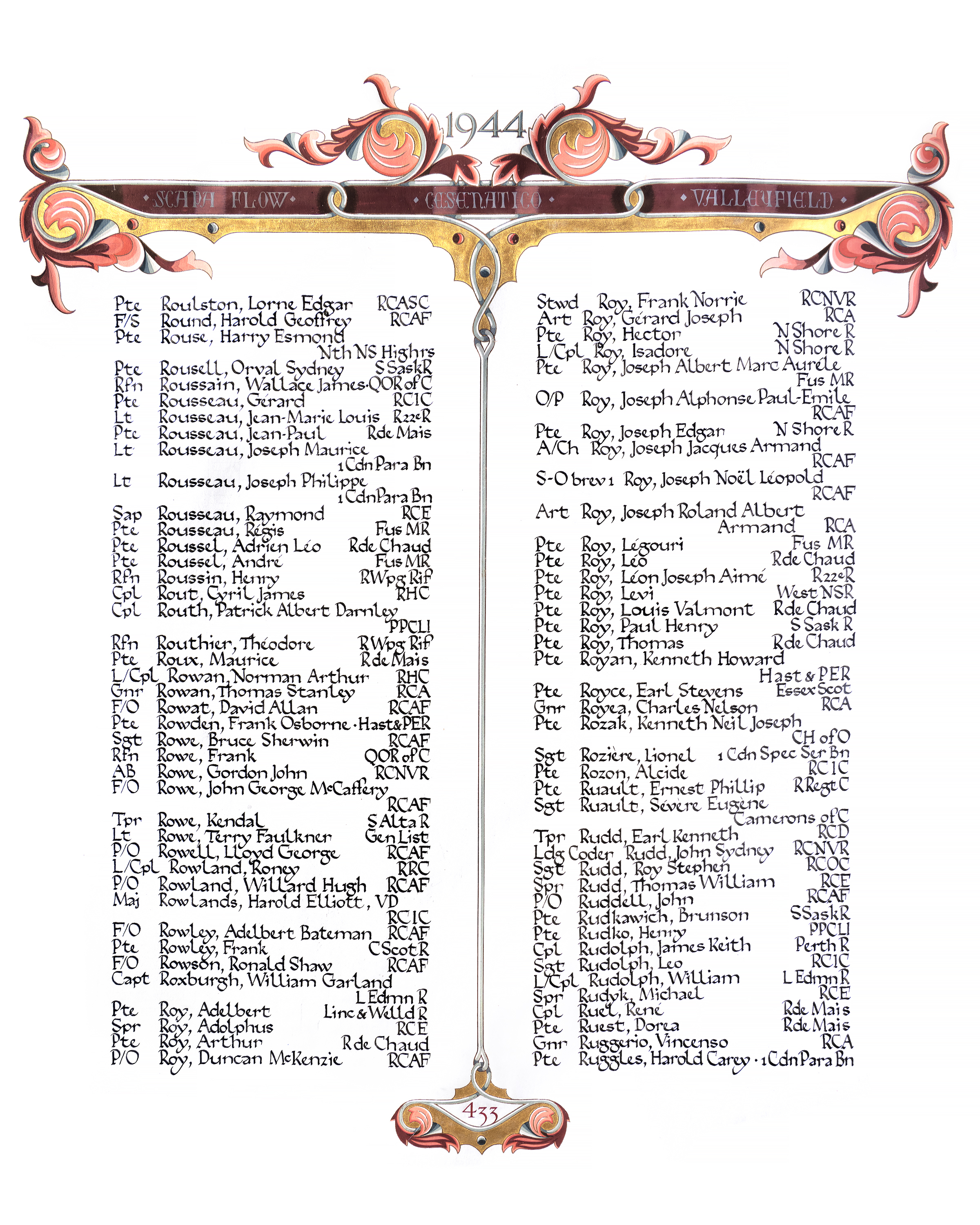 Ships served in: CALGARY DIVISION RCNVR - Enlisted 30 Jan 1941 * Commenced Active Service 20 May 1941 as an Ordinary Visual Signalman, RCNVR HMCS STADACONA - Drafted to STADACONA 15 Jun 1941 HMC SIGNAL SCHOOL - Drafted to HMC SIGNAL SCHOOL 01 Jul 1941 * Rated Ordinary Coder, RCNVR 12 Sep 1941 HMCS ALGOMA - Drafted to ALGOMA 16 Sep 1941 * Rated Coder, RCNVR 20 May 1942 * Rated Acting Leading Coder, RCNVR 01 Mar 1943 HMCS STADACONA - Drafted to STADACONA 14 Feb 1944 HMCS THUNDER - Drafted to THUNDER 16 Feb 1944 HMCS STADACONA - Drafted to STADACONA 18 Feb 1944 HMCS VALLEYFIELD - Drafted to VALLEYFIELD 27 Feb 1944 * Rated Leading Coder, RCNVR 01 Mar 1944