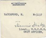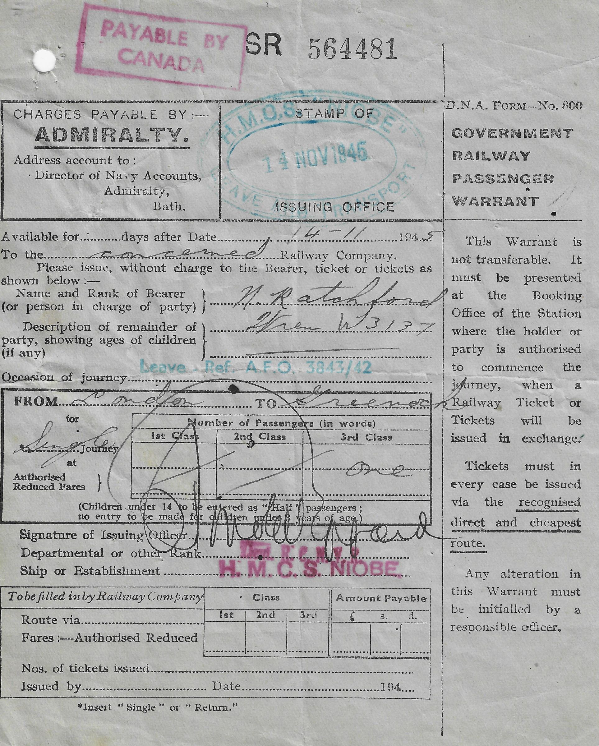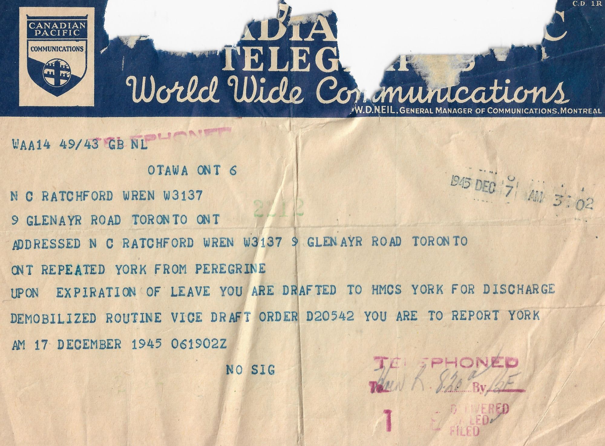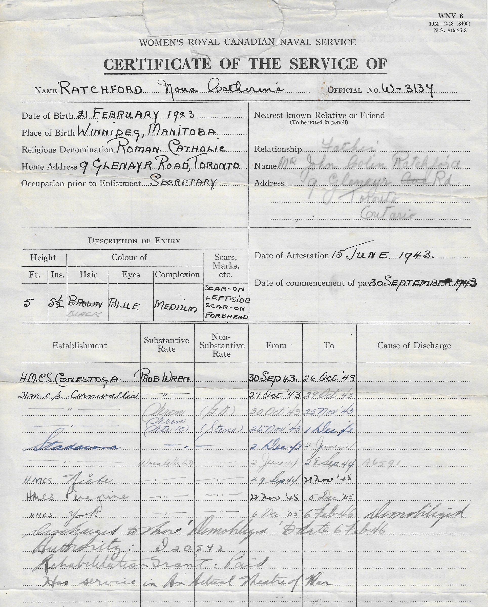 (NCR001) Wren Nona Ratchford (NCR002) Certificate of Service pg 1 (NCR003) Instructions to report to HMCS YORK for medical recheck and travel orders dated 02 Sep 1943 (NCR004) Train Travel Warrant dated 14 Nov 1945 - London to Greenock (NCR005) Telegraph dated 07 Dec 1945 - drafting instructions for demobilization