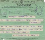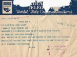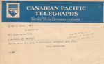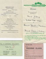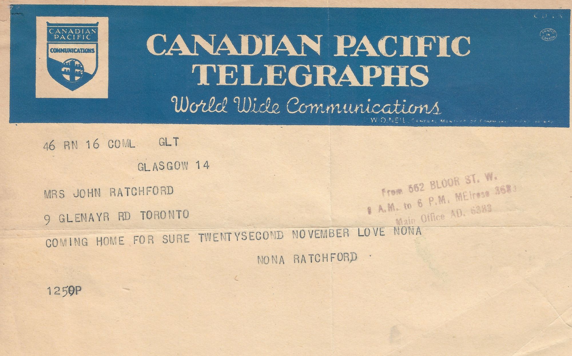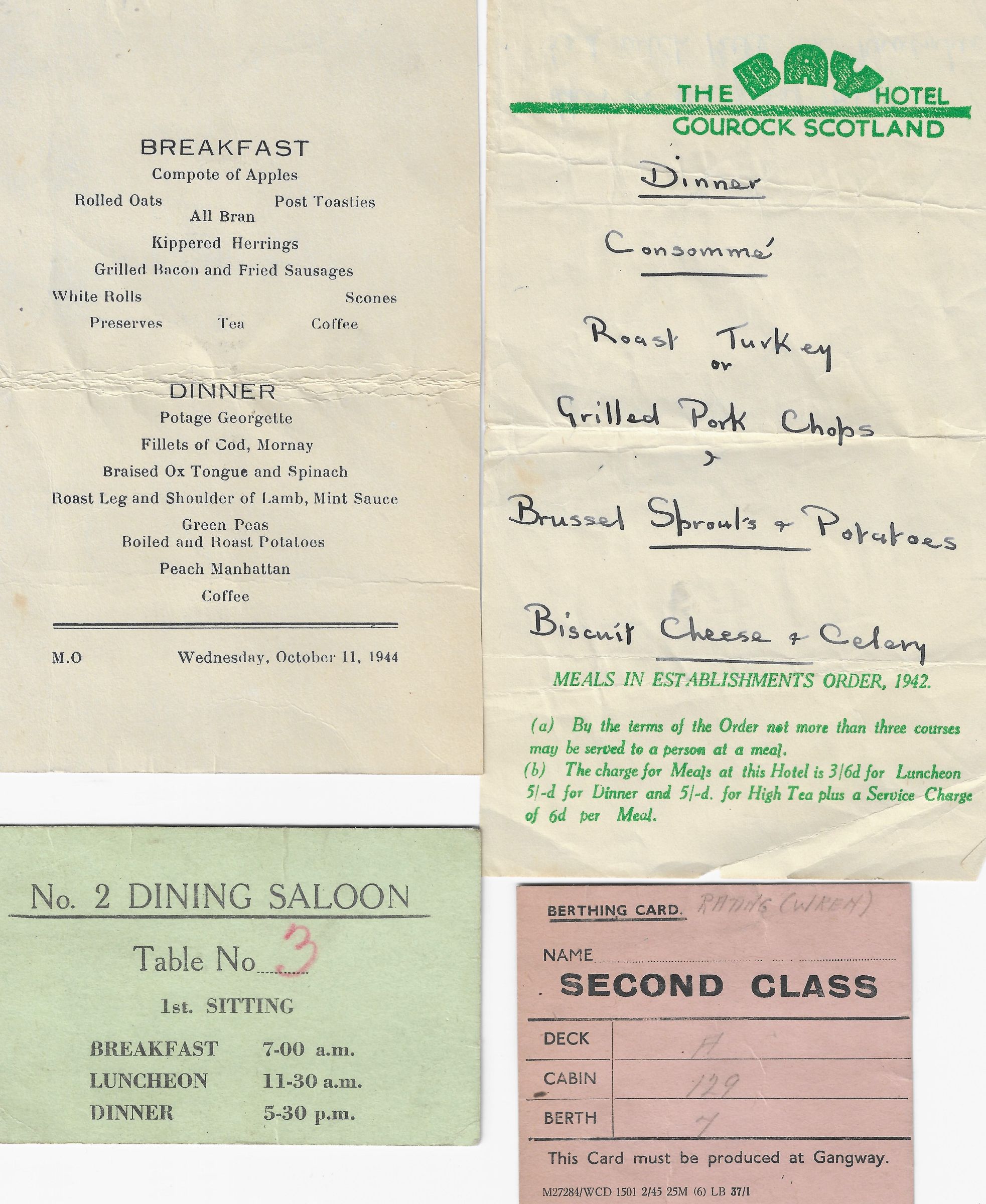 (NCR006) Christmas telegram to Nona from her parents (NCR007) Undated telegram - Nona telling her parents she will be home for sure on the 22nd November (NCR008) Souvenir Restaurant menu for The Bay Hotel, Gourock, Scotland, a Dining table card and a Second Class Berth Ticket (NCR009) Leave ticket HMCS PEREGRINE 29 Nov - 17 Dec 1945 (NCR010) Confirmation of return of respirator, HMCS PEREGRINE 29 Nov 1945