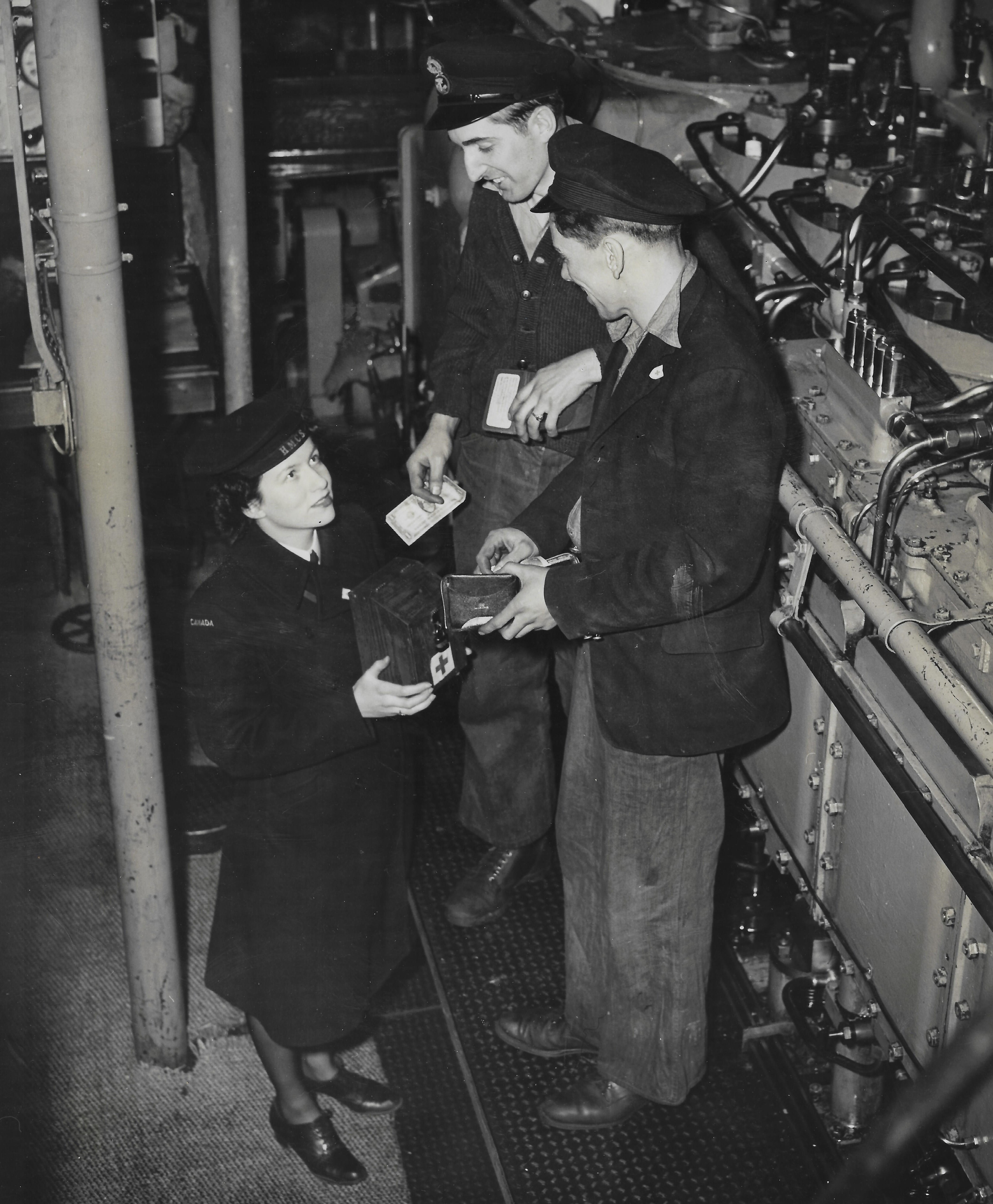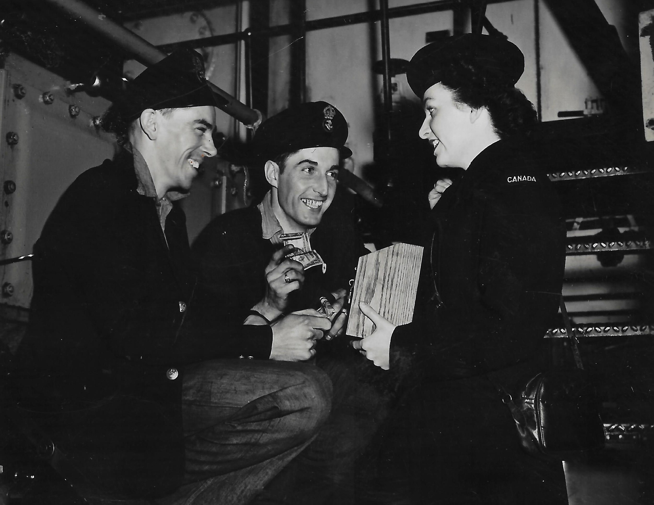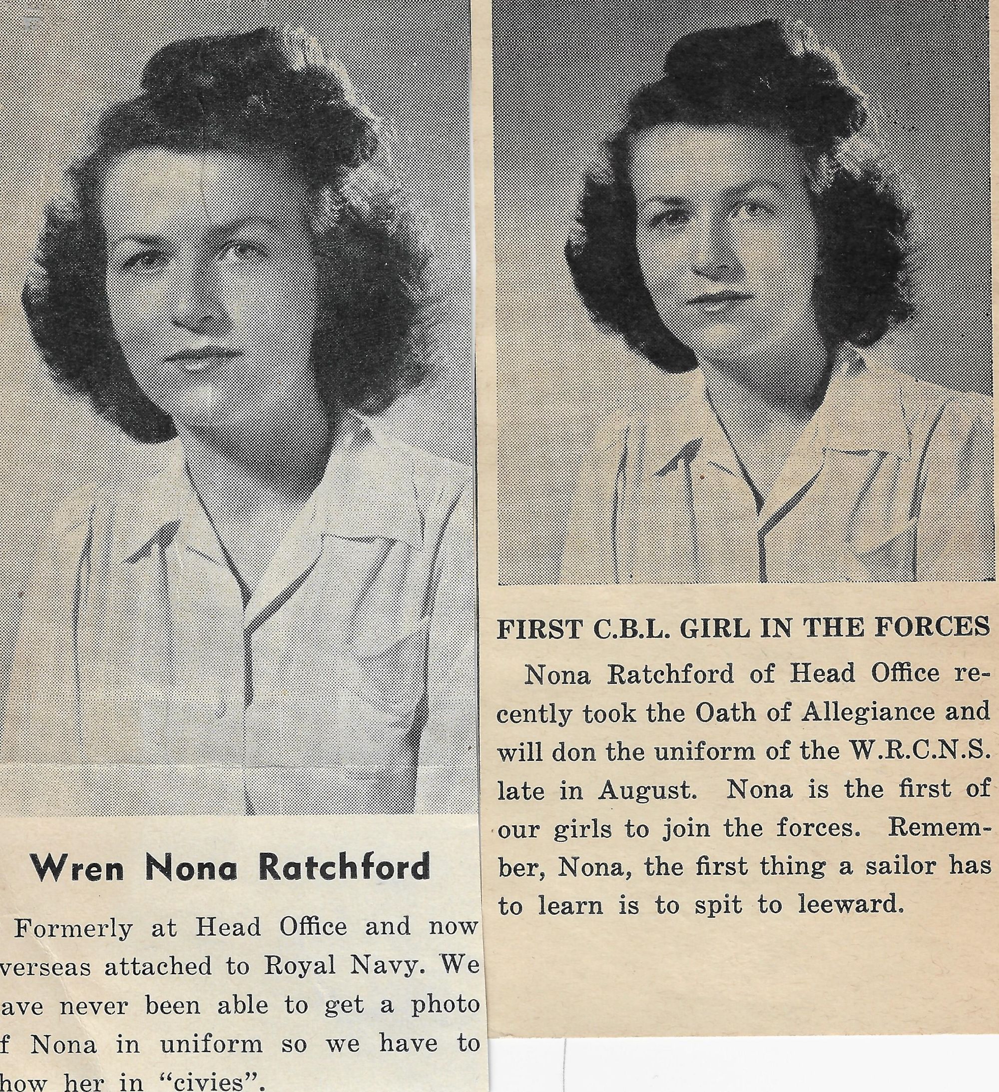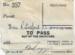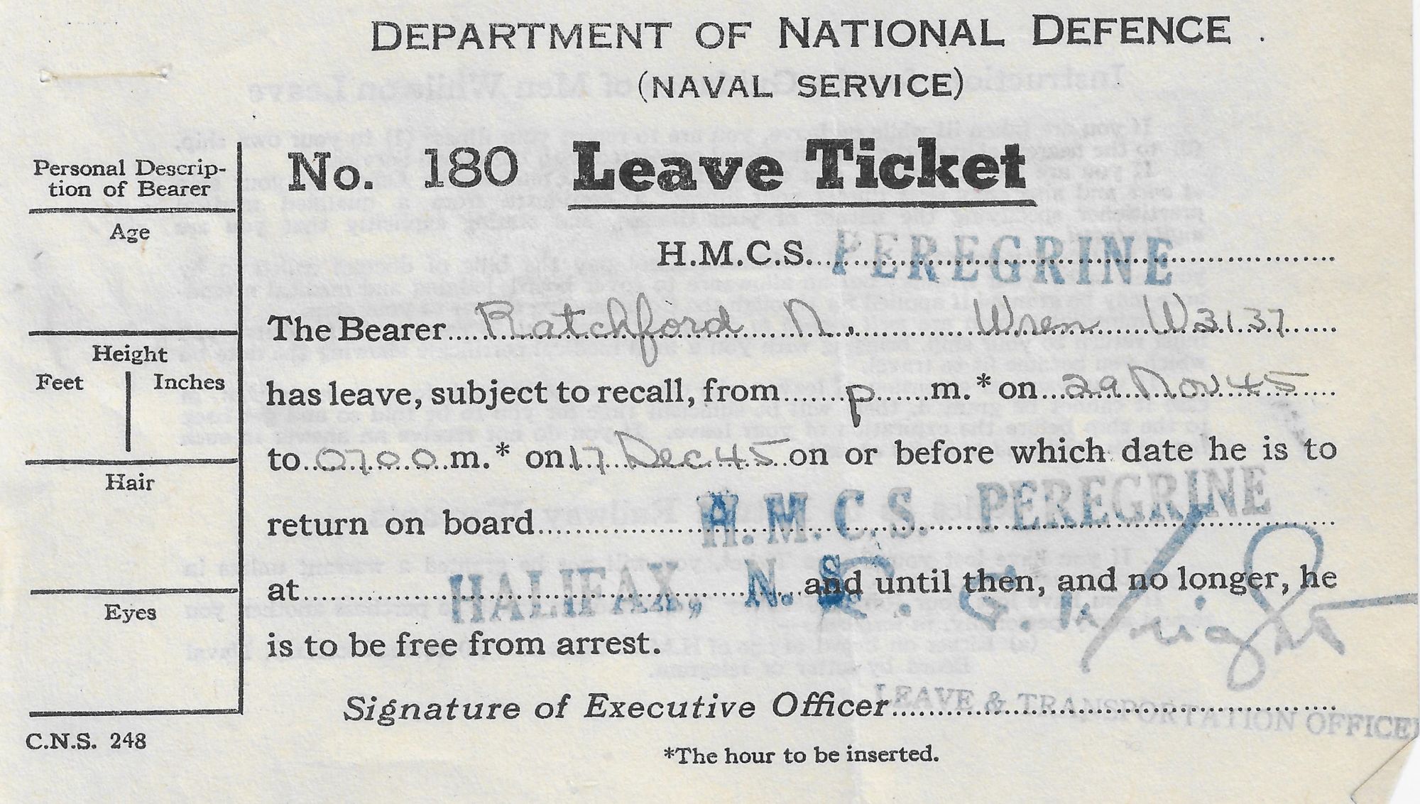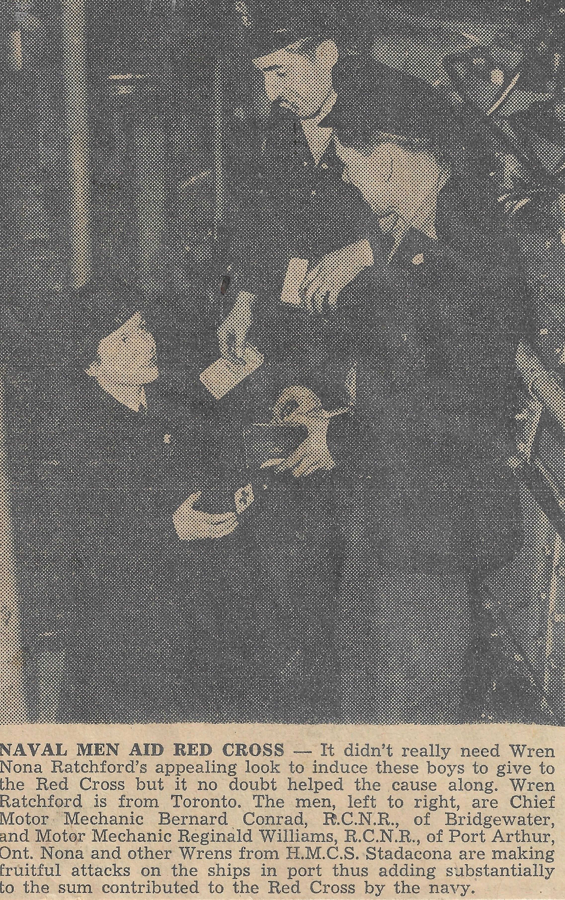 (NCR017) Pass for Wren Ratchford to leave dockyard while on duty. The pass does not say which dockyard - presumed to be HMC Dockyard, Halifax (NCR018) “Captains Picnic September 1944 - Marg Murphy, Sheila Hawkings and Me (Nona Ratchford)” (NCR019) Article - Red Cross Donation Drive: Wren Nona Ratchford canvassing for the Red Cross onboard HMCS PORT ARTHUR. Mentioned in the article: Chief Motor Mechanic Bernard Conrad, RCNR of Bridgewater, NS and Motor Mechanic Reginald Williams, RCNR of Port Arthur, Ontario. (NCR020-NCR021) Photos associated with the Red Cross Donation Drive article