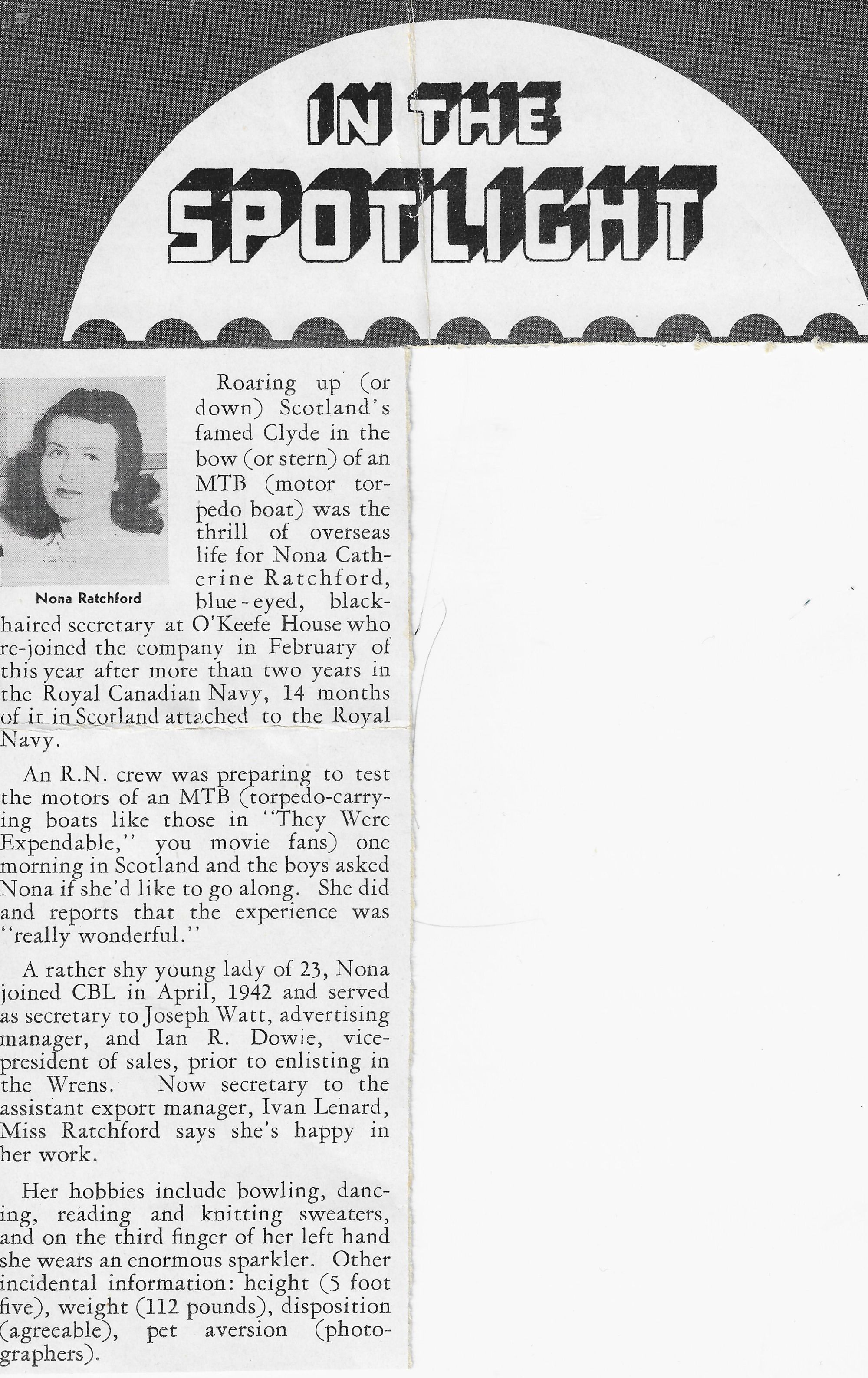 (NCR011) Restaurant ticket - Rogana Restaurant & Sea Food Bar, Exchange Place, Glasgow, Scotland (NCR012) Carling Brewery Newsletter articles - Nona Ratchford joined the WRCNS (NCR013) "In the Spotlight" - Article on Nona Ratchford (NCR014) Poem about Halifax during the Second World War .... not very flattering (NCR015) Unknown sailor and wren dancing on the jetty with a few other Wrens and a corvette's crew watching ... presumably V.E. Day or after.
