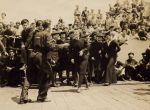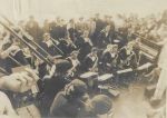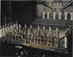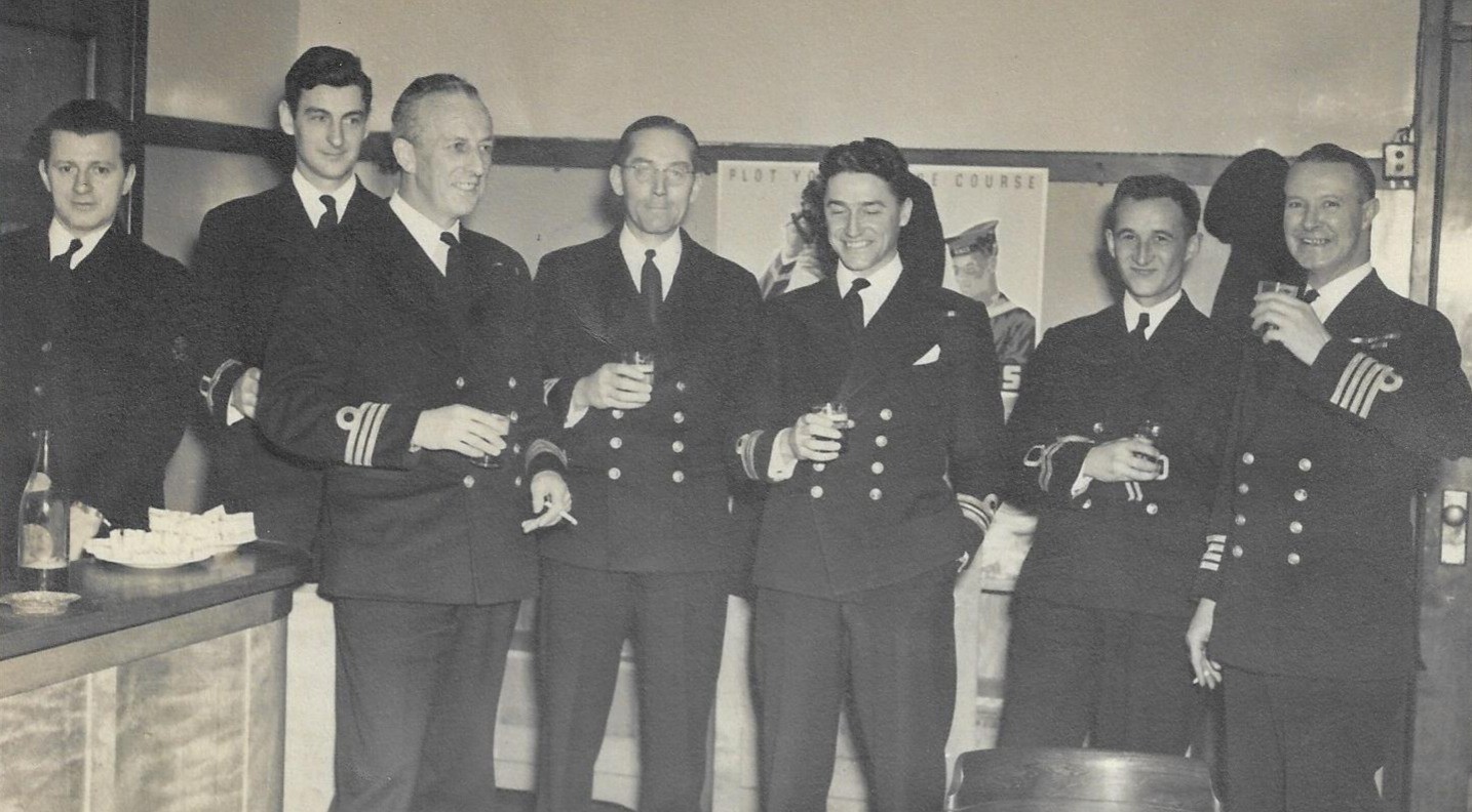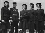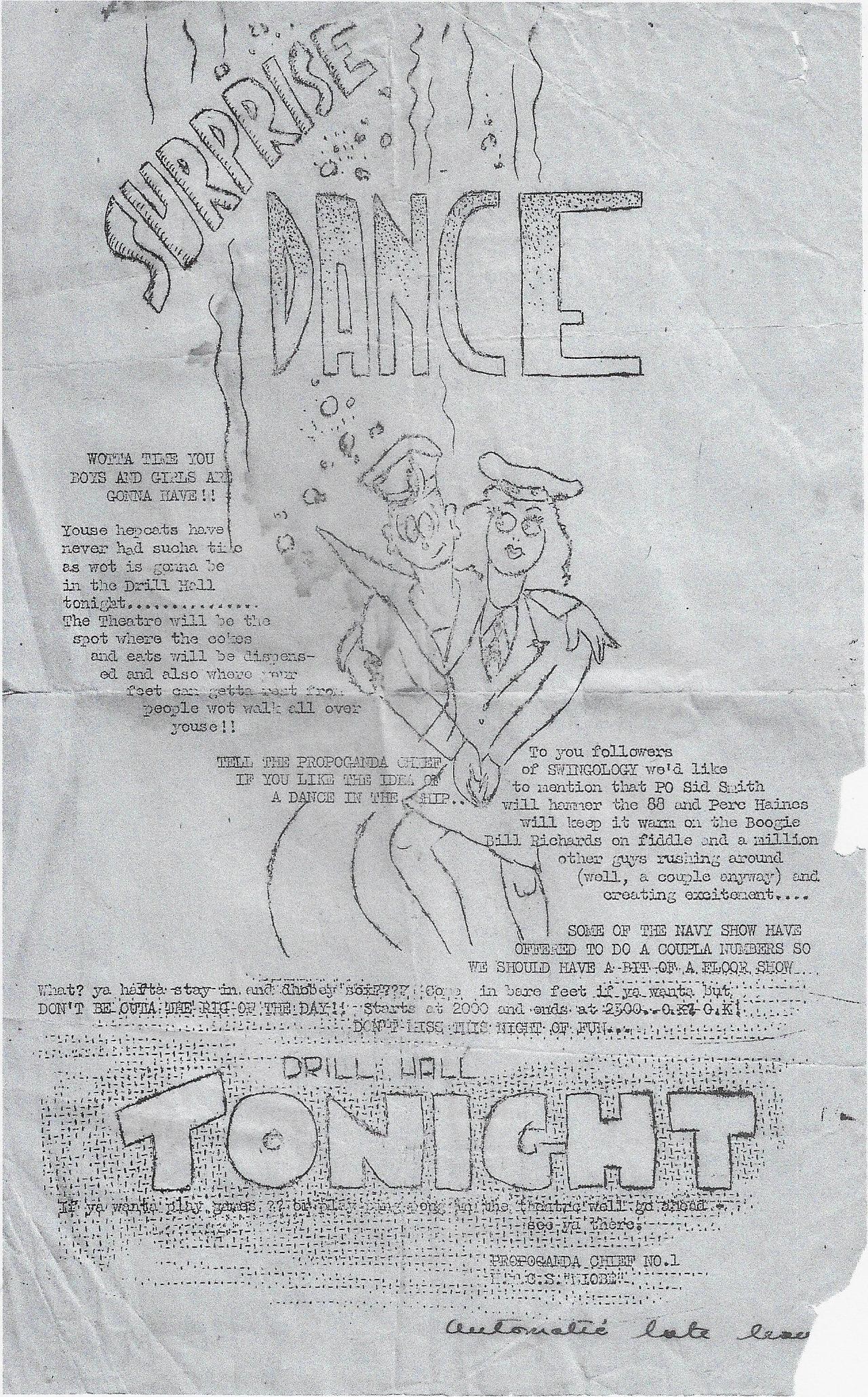 (NCR051) Christmas dinner menu at HMCS NIOBE - Dec 1944 (NCR052) Poster for a surprise dance night in the drill hall at HMCS NIOBE (NCR053) “The Band, Niobe Cruise, Summer 1945” Autographed names: Bensted, Kelcey, Sinden, Muir, Beise, Hall, Terry, Rutledge, Trono, Planter, Jones (NCR054) Unknown Captain sitting at his desk ... looking somewhat stern. (NCR055) Wrens with an unknown officer - possibly Free French or perhaps a Gendarme