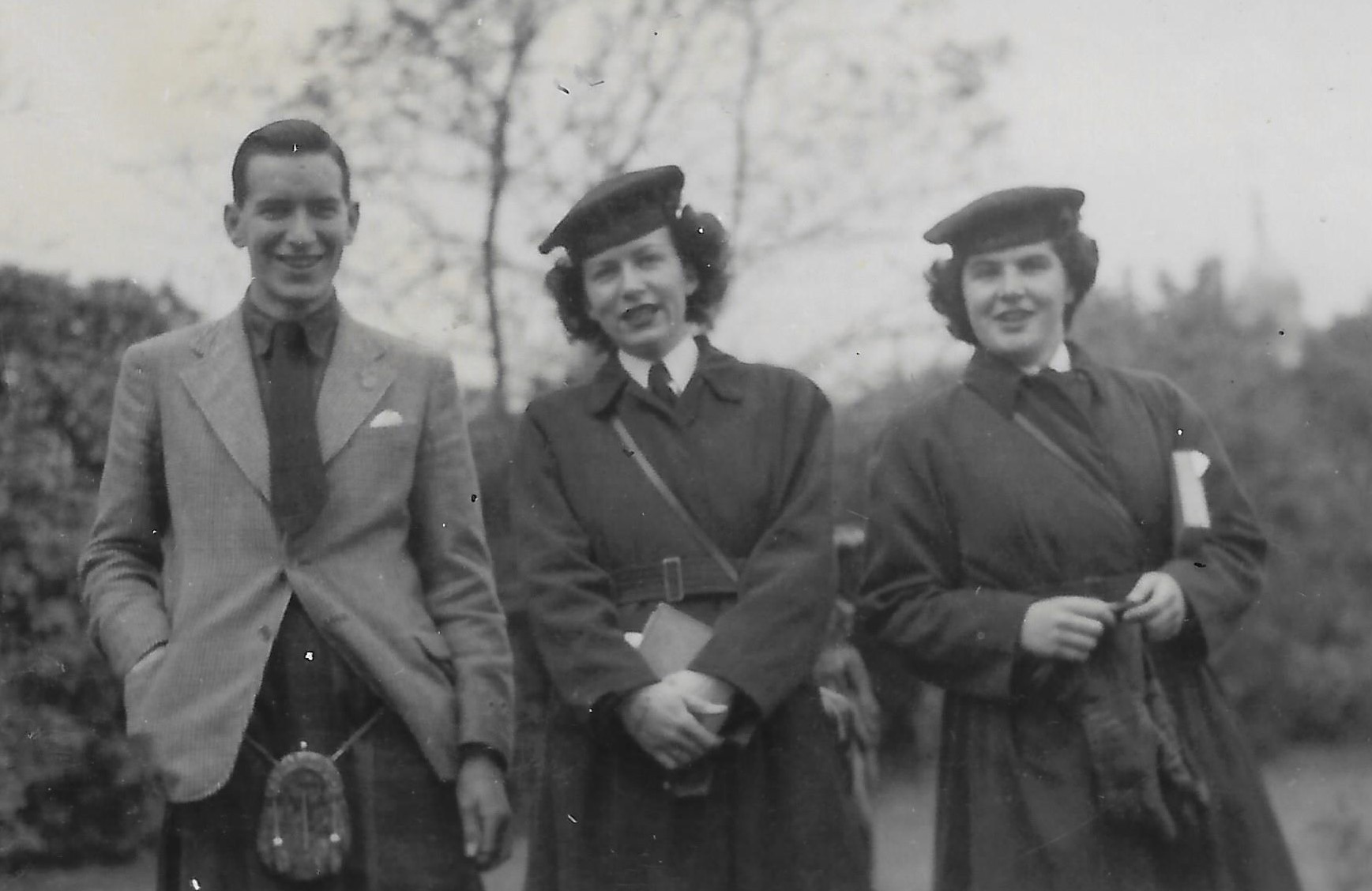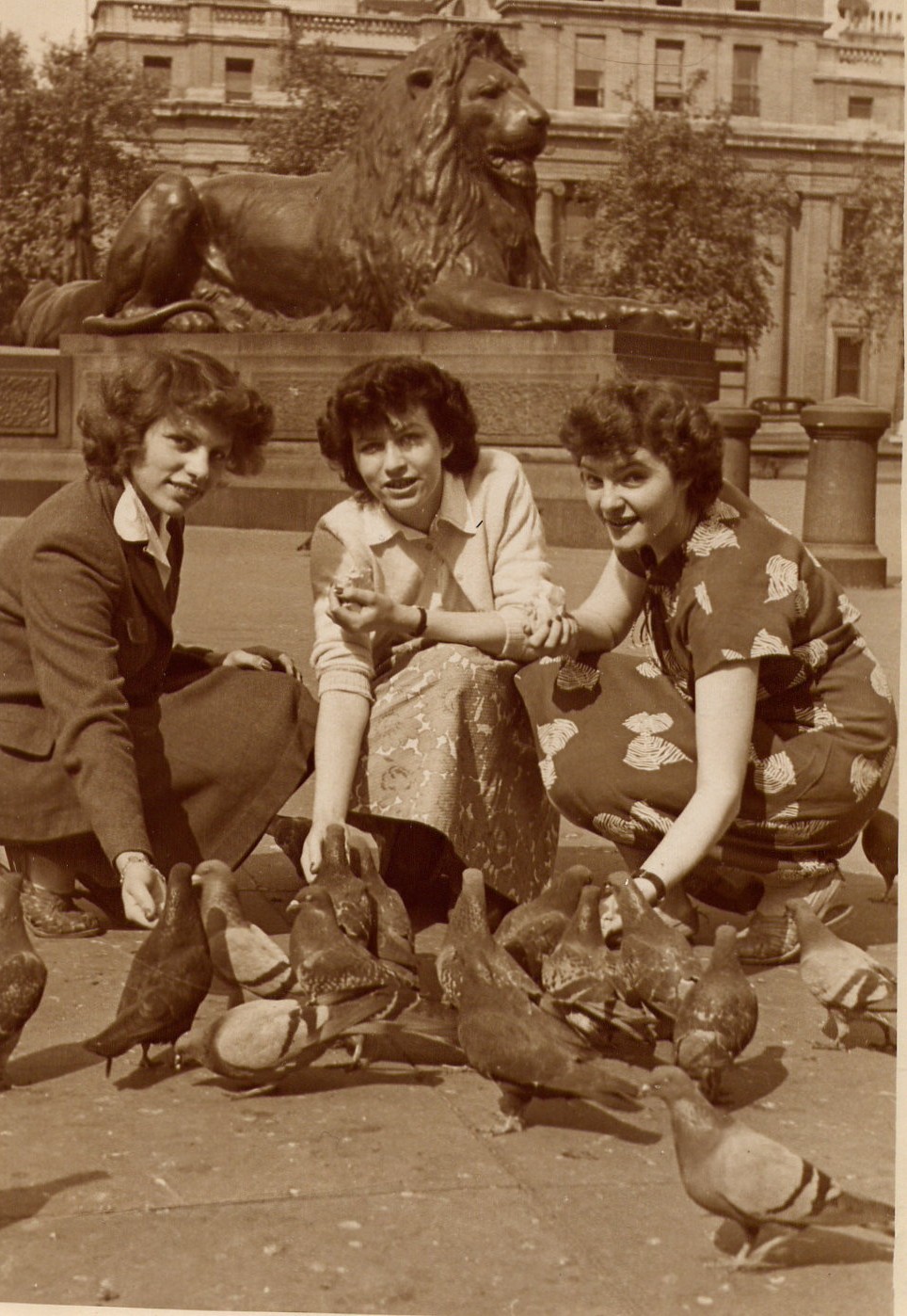 (NCR023) Wren Nona Ratchford , centre, with 2 unknown Wrens feeding pigeons at Trafalgar Square, London, England (NCR024) Write-up on the "Greenock Gals" at HMCS NIOBE (NCR025) Country side around Greenock, Scotland (NCR026) Unknown male, Nona Ratchford (centre) and Felice Arsenault of PEI