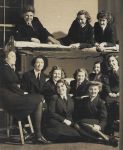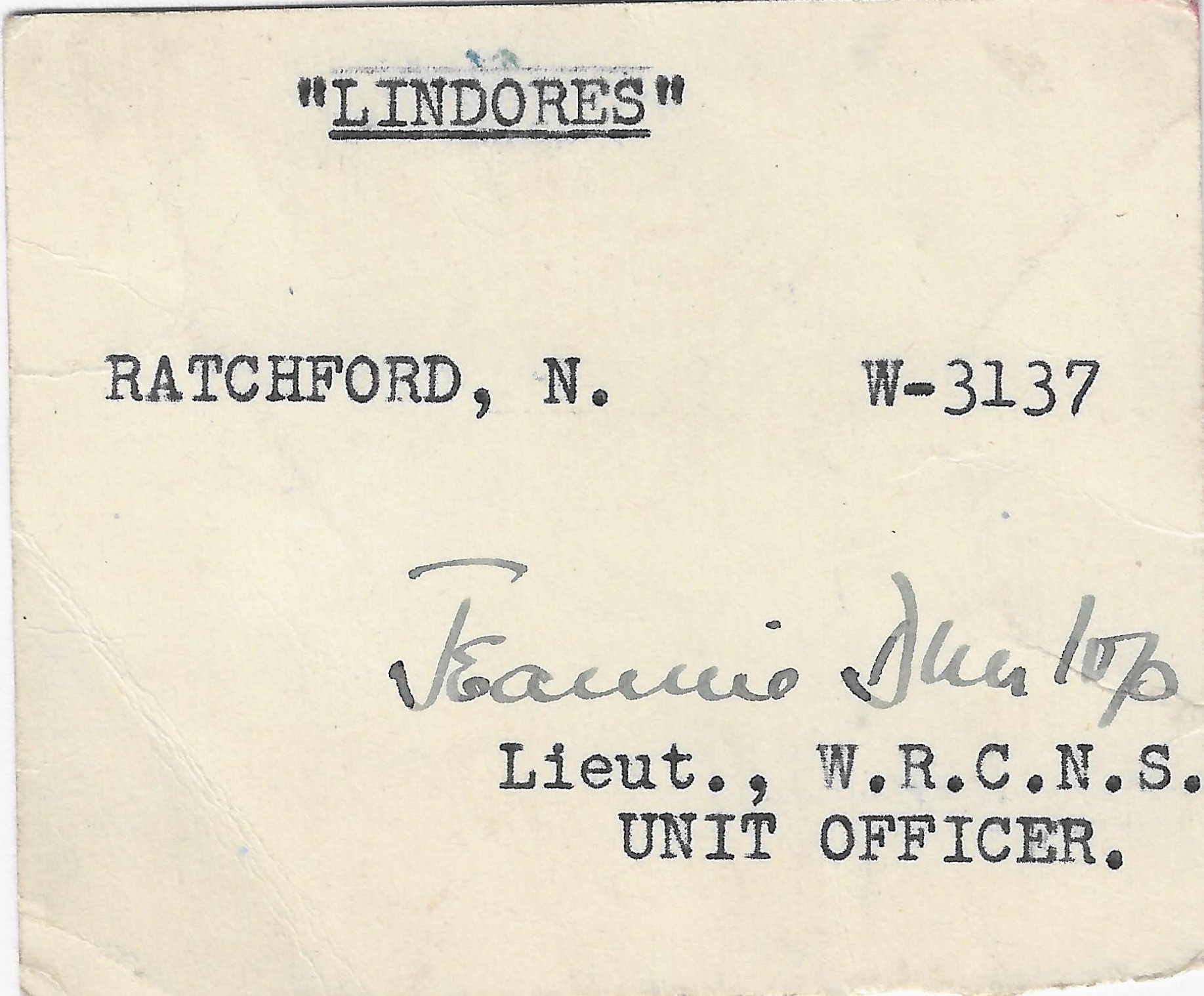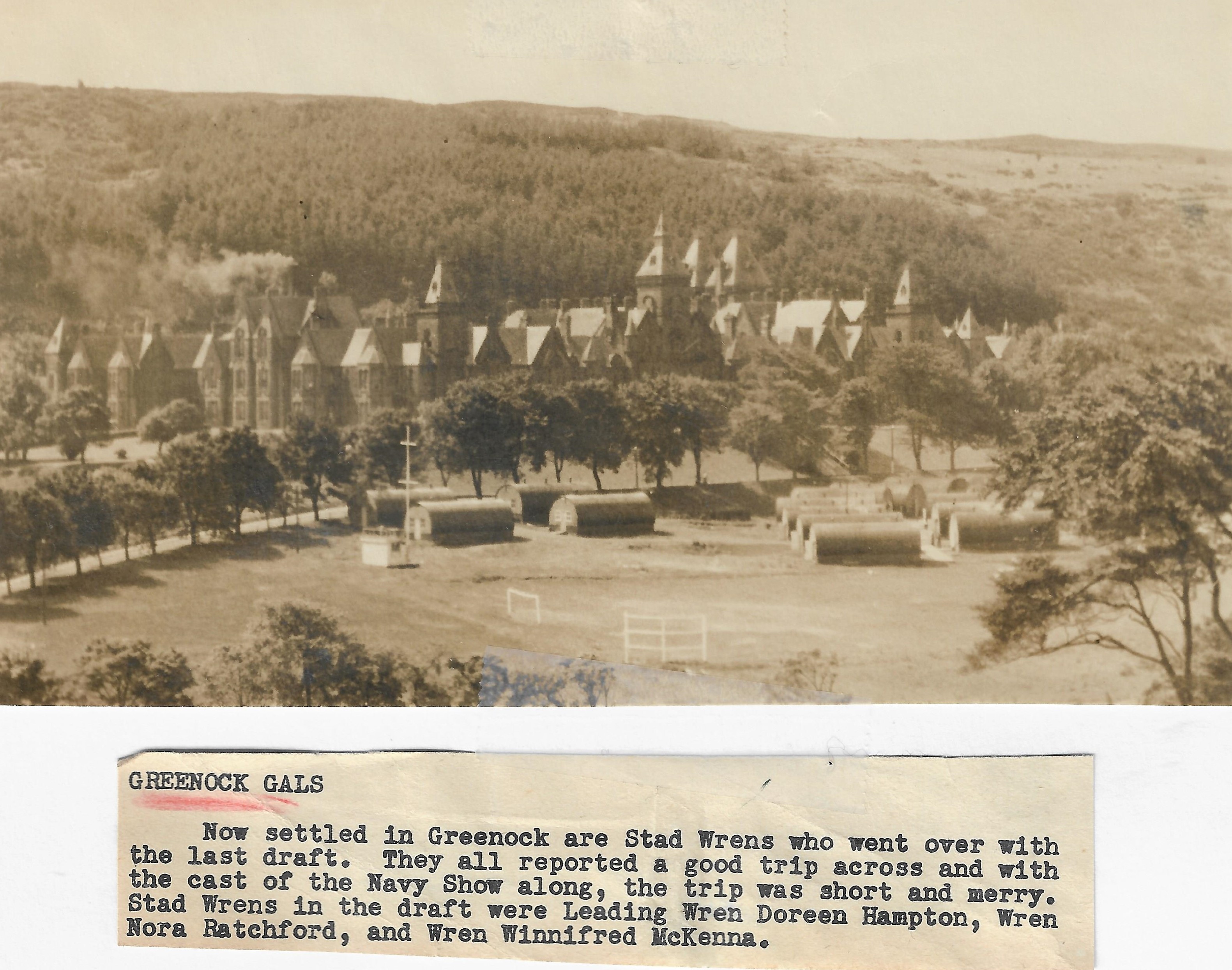 (NCR027) “Though wintry winds blow from Scotch shores, our Wrens are snug, here at “Lindores – Nona Ratchford, Toronto; Norma Perry, Montreal; Patricia Walsh, Toronto; Audrey Robinson, Winnipeg; Joyce Cudden-Woodthorpe, Toronto” // Nona Ratchford 1st on left, knitting. (NCR038) Lindores - “top bunk L to R: Vera Dickie, Ev Bowen, Marg Abel, Lower Bunk: Ruth Popkin, Ev Hicks, Marg Brown, Bunny MacDonald, Roe Evans. Chair: Genevieve Conaty Floor: Merry Fraser & Kay Genors (NCR029) Lindores Manor County House, Greenock, Scotland - accommodations for approx 80 Wrens (NCR030) Wrens in front of Lindores Manor (NCR031) Some type of index card for Lindores with Nona Ratchford's name