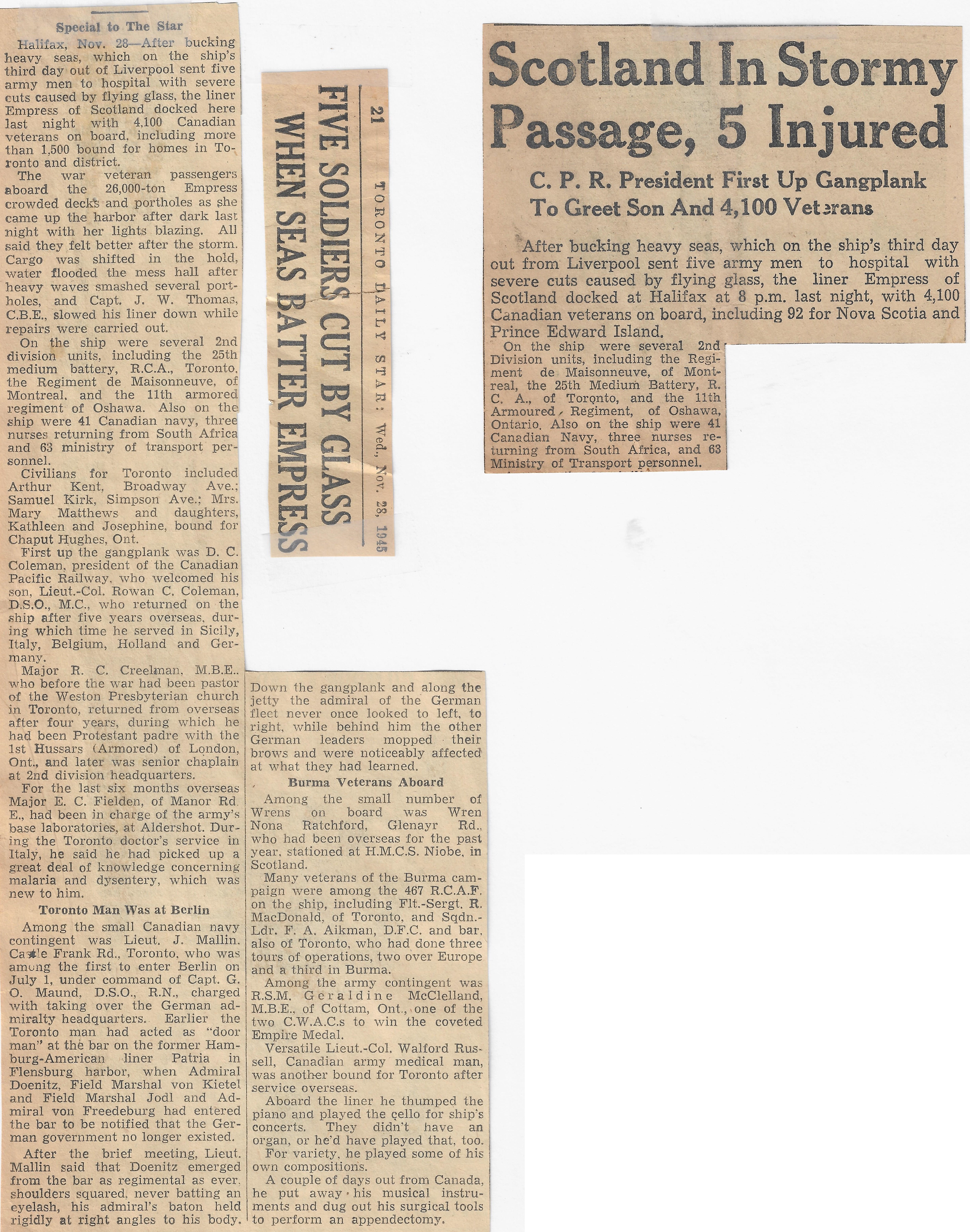 (NCR042) Empress of Scotland arrives in Halifax after Stormy Crossing with several passengers injured - The Toronto Daily Star 28 Nov 1945 (NCR043) Wrens and Sailors at a dance - location and date unknown (NCR044) Three unknown Wrens looking at a "Victory Map of Europe" (NCR045) Photo at a dinner event. Those in photo unknown