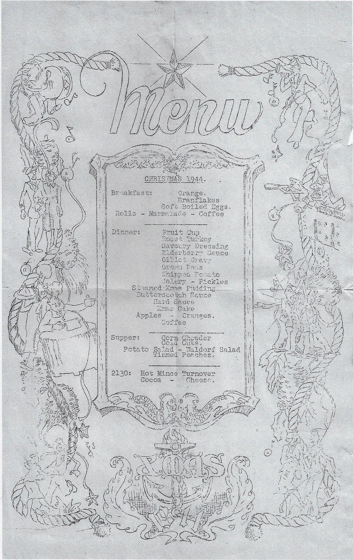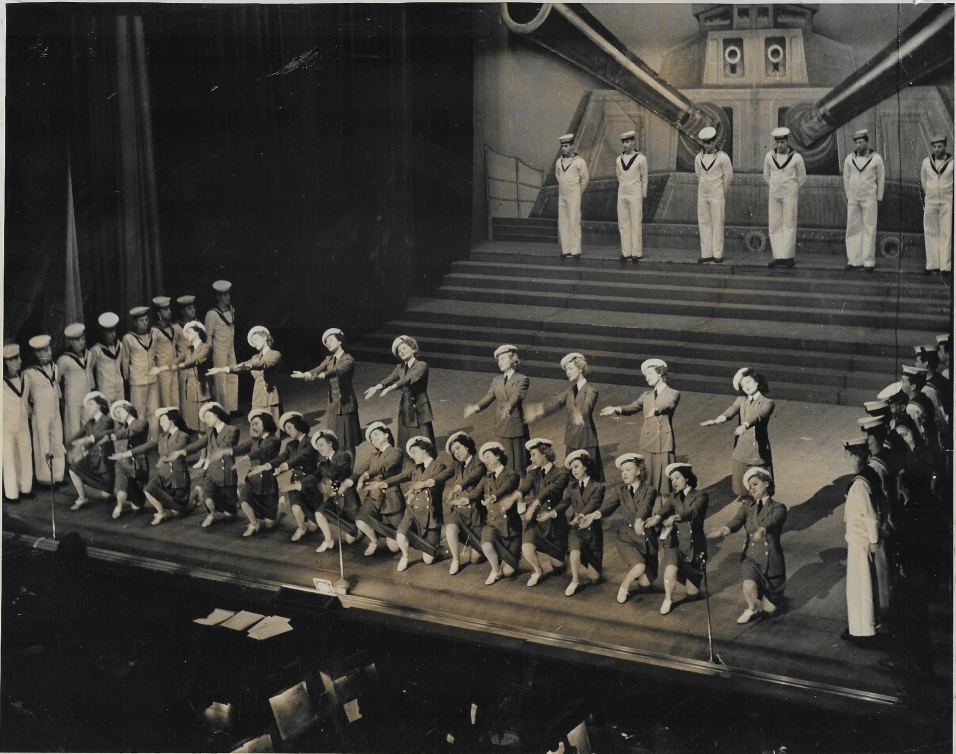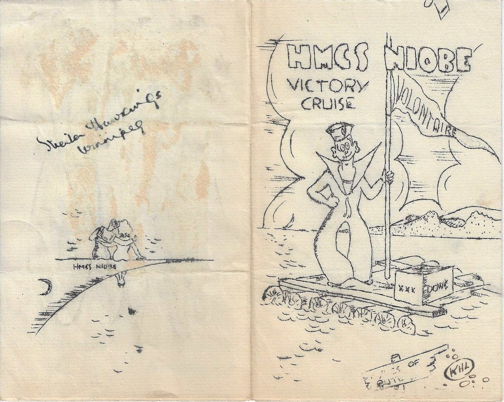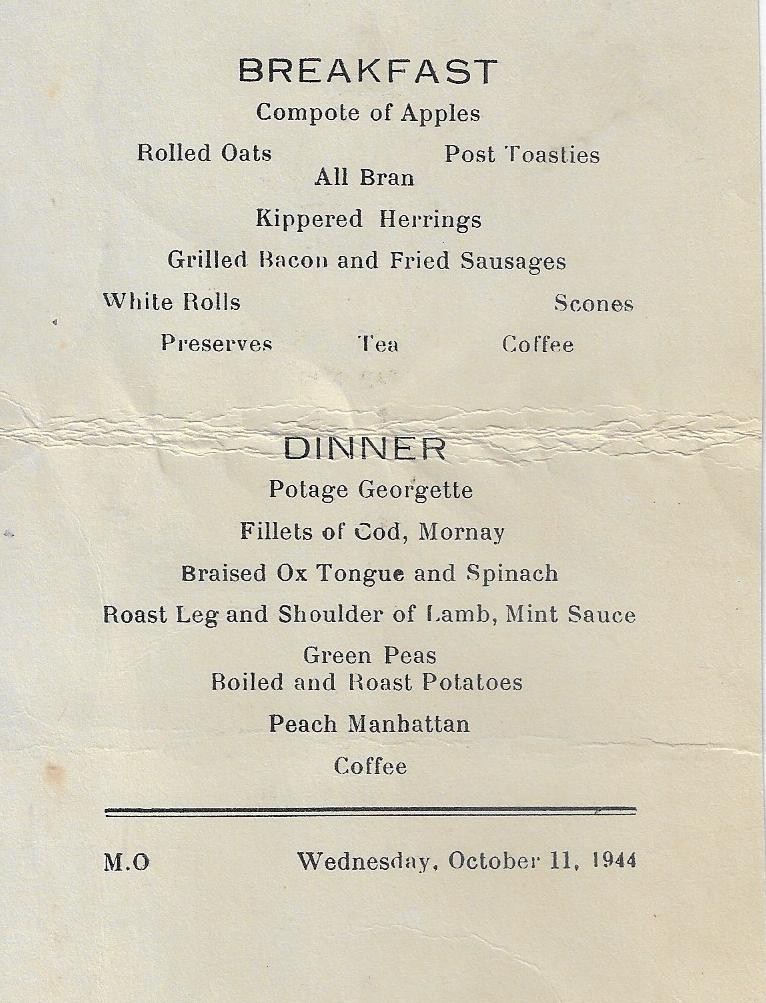 (NCR046) "HMCS NIOBE Victory Cruise" (NCR047) Divisions at HMCS CORNWALLIS. The Wrens are on the lower left hand side of the photo. (NCR058) "Meet the Navy" production at an unknown theatre (NCR059) Breakfast Menu 11 Oct 1944 - presumably at the Wren's quarters (NCR060) Unknown woman - name could be Jude, Jade, Jace.... last name "McD"