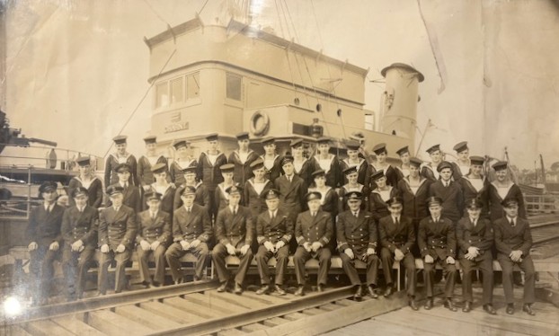 (LAG005) HMCS CHARNY crew photo. SLt Lorne Gottfred front row 5th from left This photo is also posted on the ship's company photo page for HMCS CHARNY with all crew identified