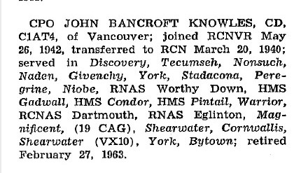Ships served in: RCNVR DIVISION VANCOUVER - Enlisted in the RCNVR 20 Mar 1940 * Transferred to the RCN 26 May 1942 RNAS WORTHY DOWN HMS GADWALL HMS CONDOR HMS PINTAIL RNAS EGLINTON HMCS MAGNIFICENT (19 CAG) HMCS SHEARWATER (VX10) * Retired 27 Feb 1963