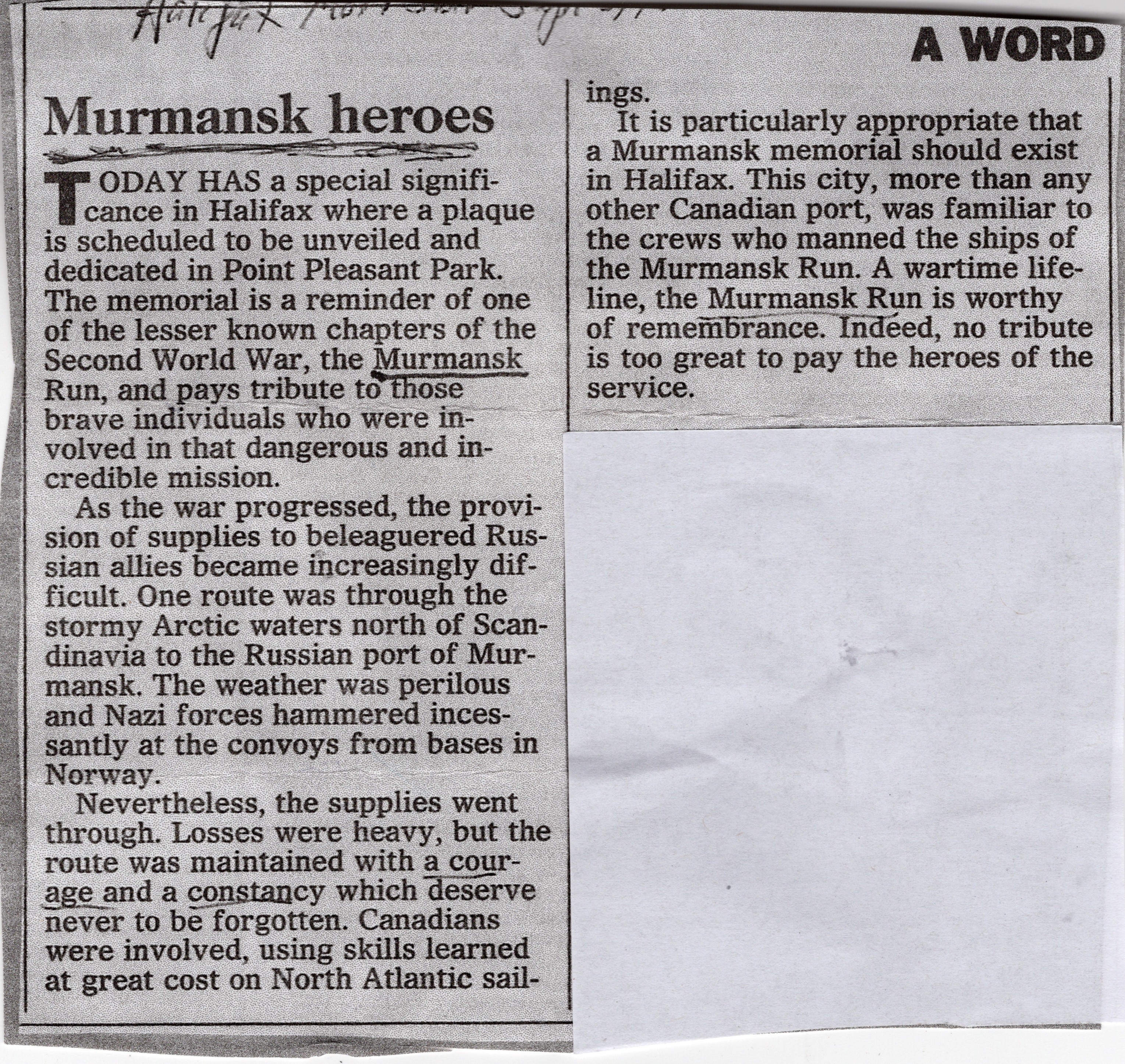(JWC001) Portrait of Lt (E) Bill Cumming (JWC002) Bill Cumming and Isabel Murray on their Wedding Day Sep 7, 1942, Westville, NS (JWC003) Bill Cumming on Graduation from McGill University (JWC004) Article on the unveiling of a Murmansk Run Memorial Plaque at Point Pleasant Park, Halifax, NS // From a Halifax newspaper
