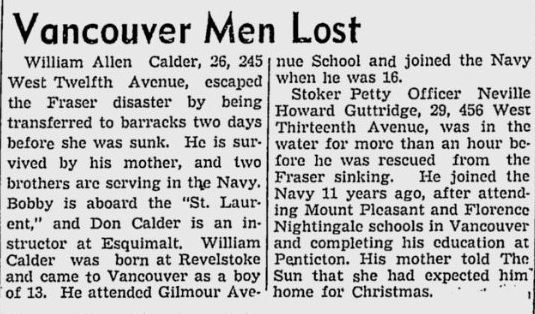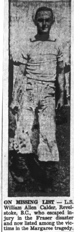 Leading Seaman Calder, age 26 was born in Revelstoke and was educated in Gilmore School, Vancouver. He had been in the Navy nine years, first serving on the destroyer HMCS Margaree, HMCS Skeena, then on to HMCS Fraser. He was drafted ashore off HMCS Fraser just days before she was sunk. LS Calder died when HMCS Margaree went down.