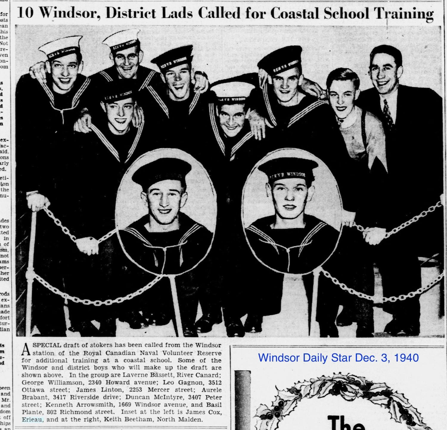 Ships served in: WINDSOR DIVISION RCNVR - Enlisted 11 Nov 1940 * Commenced Active Service 11 Nov 1940 as a Stoker 2nd Class, RCNVR HMCS STADACONA - Drafted to STADACONA 03 Dec 1940 HMCS HAMILTON - Drafted to HAMILTON 04 Jun 1941 * Rated Stoker 1st Class, RCNVR 03 Oct 1941 HMCS STADACONA - Drafted to STADACONA 09 Jul 1943 HMCS HAMILTON - Drafted to HAMILTON 09 Aug 1943 * Rated Acting Leading Stoker, RCNVR 15 Sep 1943 HMCS STADACONA - Drafted to STADACONA 01 Jun 1944 HMCS PEREGRINE - Drafted to PEREGRINE 20 Nov 1944 HMCS BITTERSWEET - Drafted to BITTERSWEET 24 Nov 1944 * Rated Acting Stoker Petty Officer, RCNVR 01 Oct 1944 HMCS NIOBE - Drafted to NIOBE 19 Jun 1945 HMCS PEREGRINE - Drafted to PEREGRINE 25 Jun 1945 HMCS HUNTER - Drafted to HUNTER 07 Jul 1945 * Demobilized 07 Aug 1945