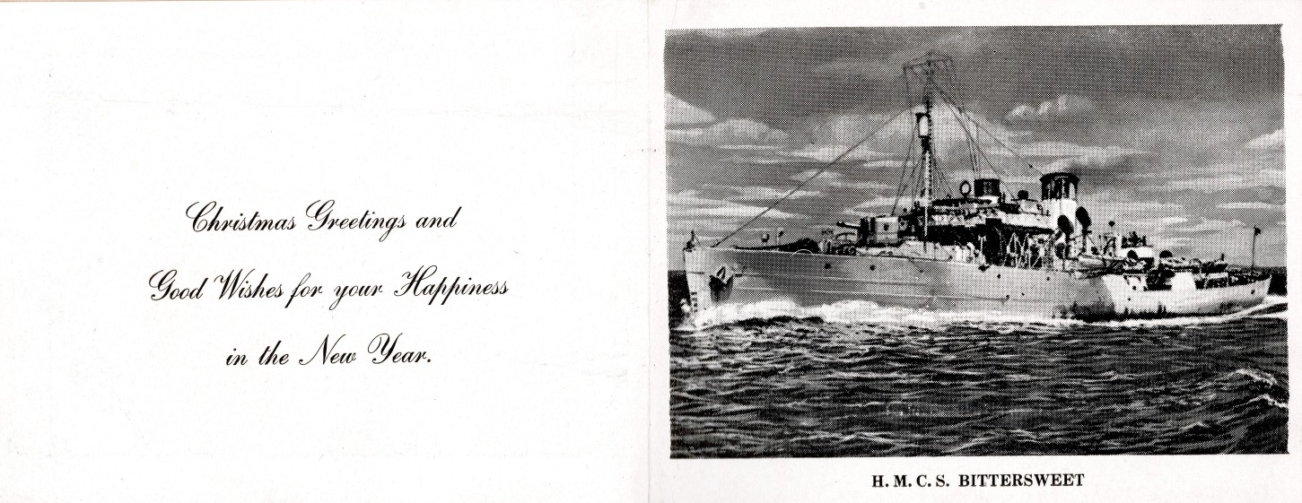 (JNC010) HMCS HAMILTON Christmas Card (JNC011) James Cox (right) and unknown CPO on HMCS HAMILTON (JNC012) HMCS BITTERSWEET Christmas Card (JNC013) Sailors on HMCS BITTERSWEET