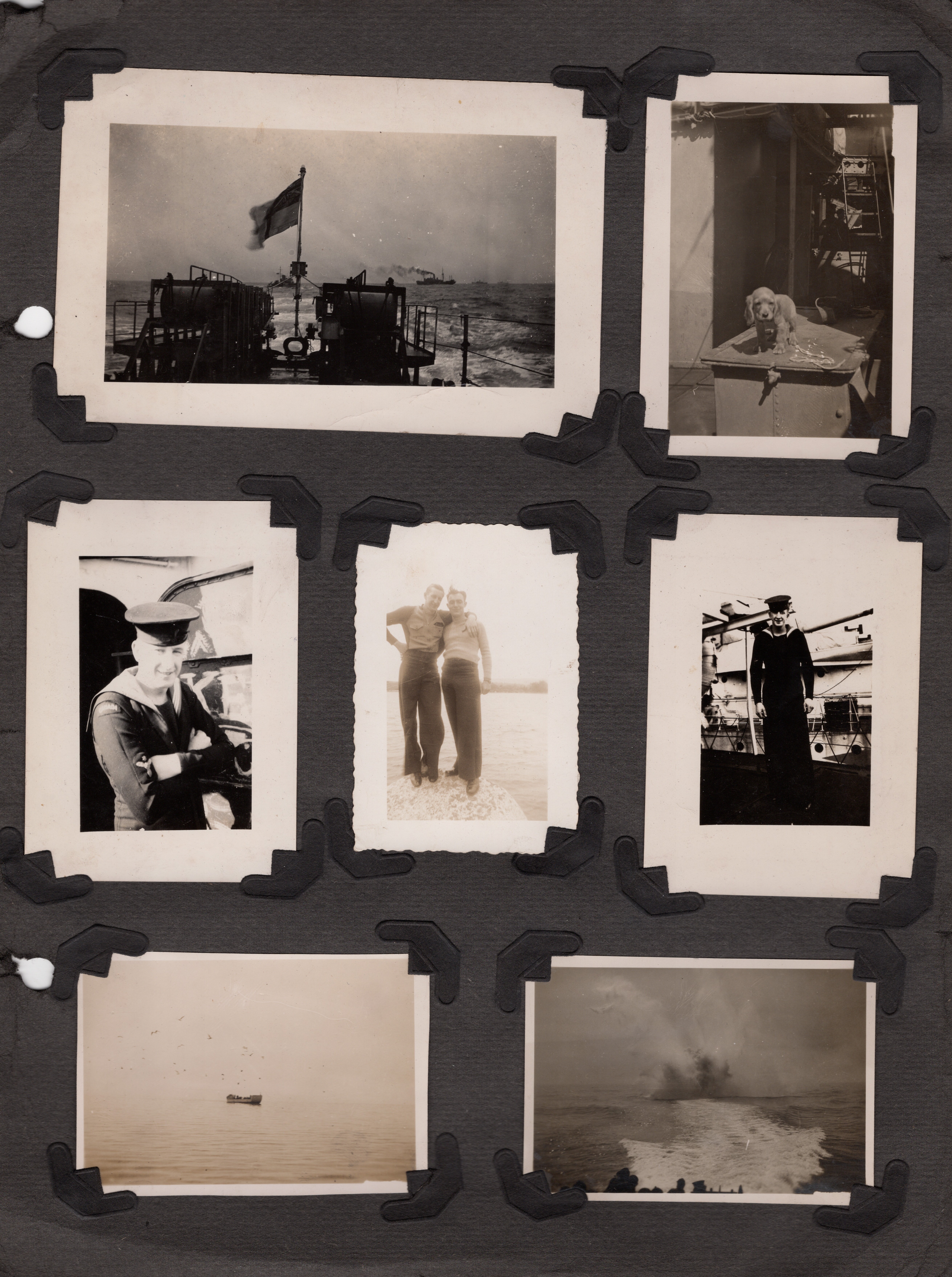 (JNC062) Unknown officer on the bridge of HMCS HAMILTON I24 (JNC063) James Cox with unknown shipmate on HMCS HAMILTON I24 (JNC064) Unknown sailors on HMCS HAMILTON I24 (JNC065) Convoy seen from HMCS HAMILTON I24. Another convoy escort is directly astern of HMCS HAMILTON (JNC066) Depth charge exploding astern of HMCS HAMILTON I24