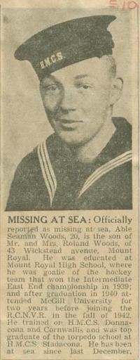 Able Seaman Woods died when his ship, HMCS VALLEYFIELD, was torpedoed and sunk on 07 May 1944 by U-548. Of her crew of 163, there were only 38 survivors.
