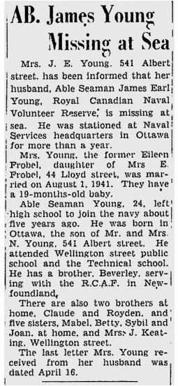 YOUNG, James Earl, AB, V6388, RCNVR, MPK - 07 May 1944, HMCS VALLEYFIELD - Son of Norman and Edith Young, of Ottawa, Ontario; husband of Eileen Young, of Ottawa.