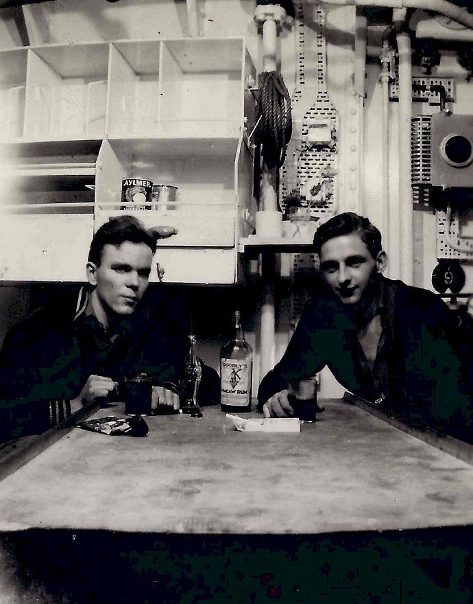 Gordon Barnson and George Learn - Stoker Mess, HMCS LA HULLOISE K668 From the collection of George Francis Learn Courtesy of Brian Learn