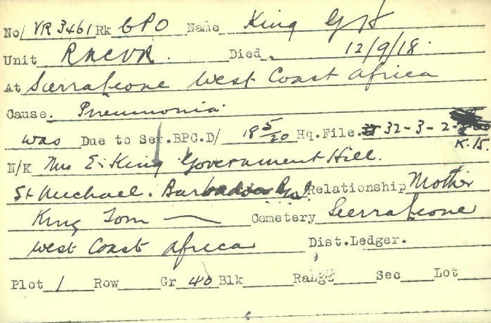 CPO King died from pneumonia. He is buried in the King Tom Cemetery, Freetown, Sierra Leone, Africa.