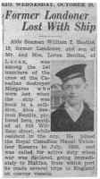 (WIB001) OS William Beattie (WIB002) Article - Former Londoner Lost with Ship // Source: VAC Canadian Virtual War Memorial (WIB003) Service file for William Beattie