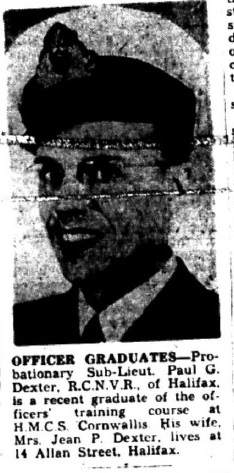 Paul G. Dexter graduated from officer training at HMCS CORNWALLIS The Halifax Mail 29 Feb 1944 Researched by George Newbury
