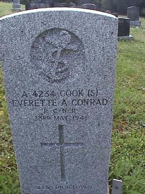 CONRAD, Everette Archibald, Ck(S), A4234, RCNR, died 23 May 1941, HMCS STADACONA (for Mechanical Training Establishment, Pictou, NS) - son of Mr. and Mrs. Archibald N. Conrad, Riverport, NS; spouse of Hildred Conrad, and father of Sylvia (8) and Greta (6) Conrad all of Lunenburg, NS.