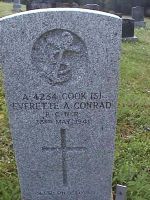 Cook (S) E. A. Conrad died in Sutherland Memorial Hospital, Pictou, Nova Scotia due to bronchial pneumonia. Prior to enlisting, he was a cook on the MV Playmaid out of Lunenburg, NS. Everette is buried in the Shepard's Hill Cemetery, Riverport, Lunenburg Co., NS.