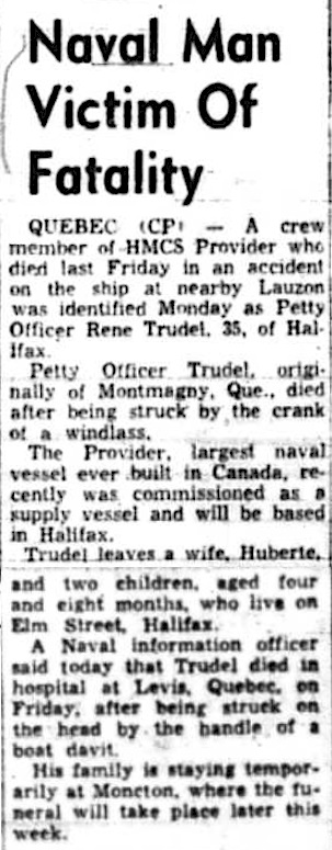 Quebec (CP) - A crew member of HMCS PROVIDER who died last Friday in an accident on the ship at nearby Lauzon was identified Monday as Petty Officer Rene Trudel, 35, of Halifax. Petty Officer Trudel, originally of Montmagny, Que., died after being struck by the crank of a windlass. The PROVIDER, largest naval vessel ever built in Canada, recently was commissioned as a supply vessel and will be based in Halifax. Trudel leaves a wife, Huberie, and two children, aged four and eight months, who live on Elm Street, Halifax. A Naval information officer said today that Trudel died in hospital at Levis, Quebec, on Friday, after being struck on the head by the handle of a boat davit. His family is staying temporarily at Moncton where the funeral will take place later this week.