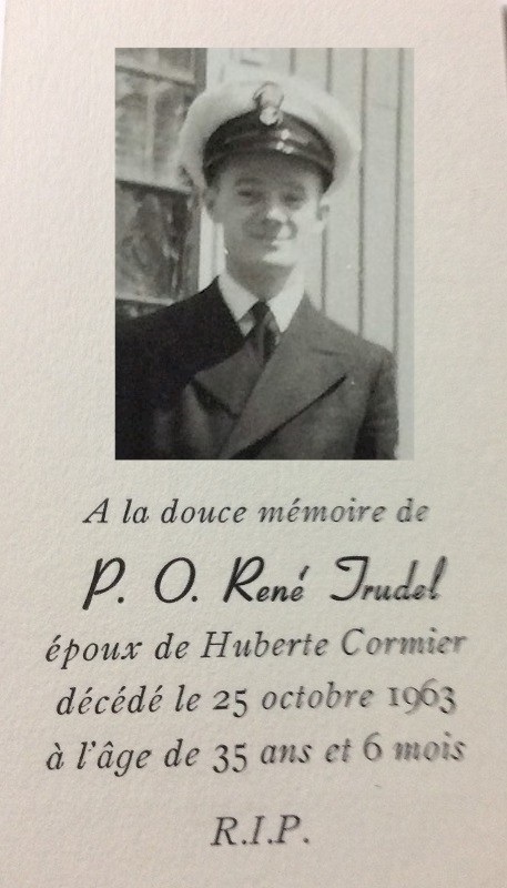 Summary from BOI report: PO1 R.P.J. Trudel, 9833-H, was presumably killed when he inadvertently left the handle shipped for manually raising the whaler at the starboard after davit, then started the electric motor to raise the boat to the davit head. The handle appeared to have struck several blows, inflicting fatal injuries. PO1 Trudel was on duty at the time of his death. His death was ruled accidental by the civilian coroner.  The death of PO1 Rene P.J. Trudel was attributable to military service.