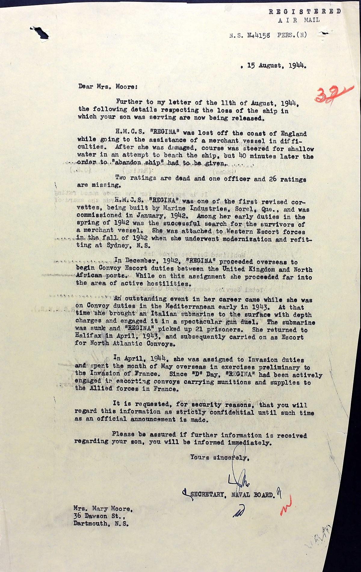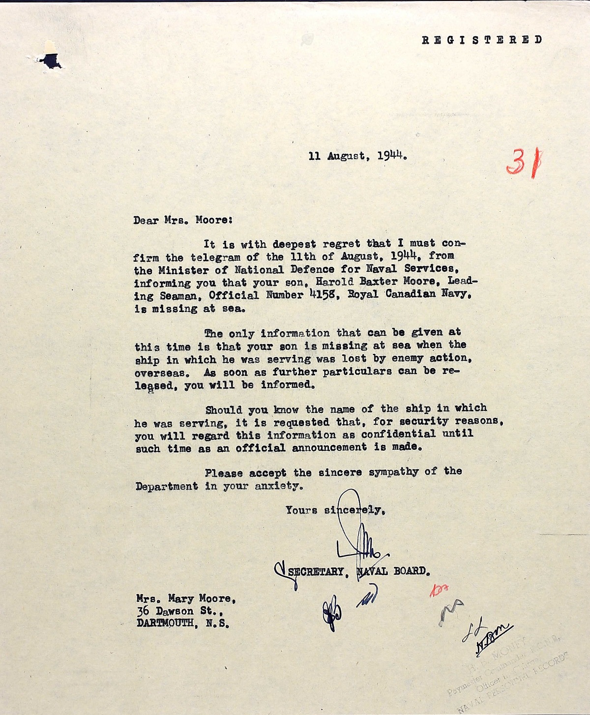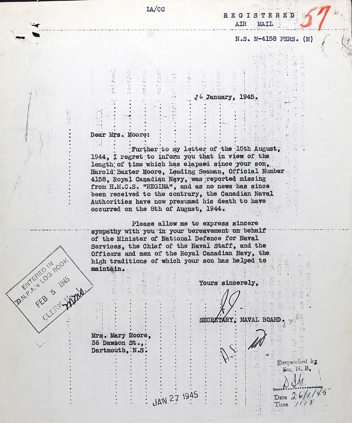 MOORE, Harold Baxter, LS AA3, 4158, RCN, MPK - 08 Aug 1944, HMCS REGINA - son of Richard Henry and Mary Moore, of Dartmouth, Nova Scotia.