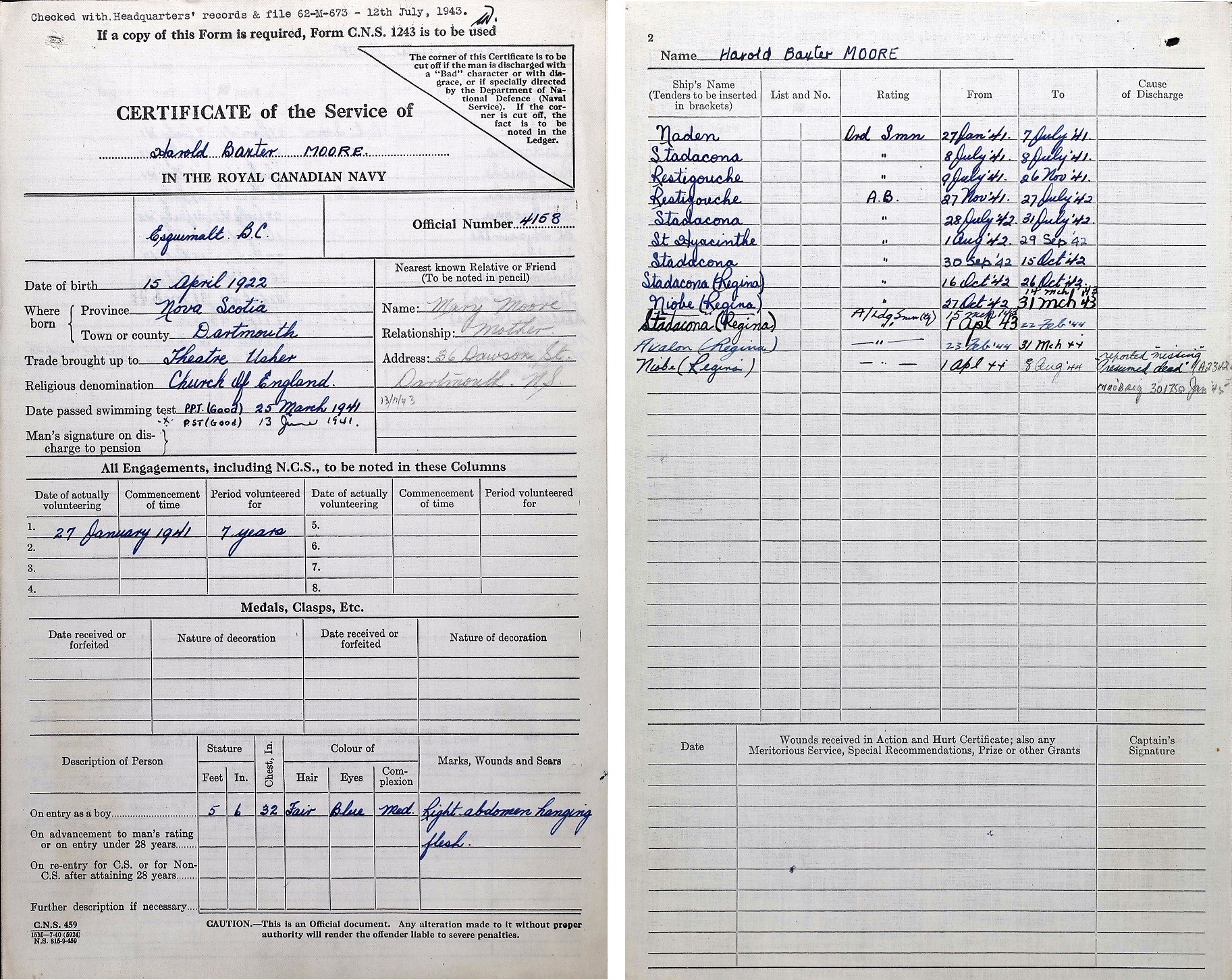 Ships served in: HMCS NADEN - Enlisted 27 Jan 1941 as an OS, RCN HMCS STADACONA - Drafted to STADACONA 08 Jul 1941 as an OS, RCN HMCS RESTIGOUCHE - Drafted to RESTIGOUCHE 09 Jul 1941 as an OS, RCN * Rated AB 27 Nov 1941 HMCS STADACONA - Drafted to STADACONA 28 Jul 1942 as an AB, RCN HMCS ST HYACINTHE - Drafted to ST HYACINTHE 01 Aug 1942 as an AB, RCN * Rated AA3 24 Sep 1942 HMCS STADACONA - Drafted to STADACONA 30 Sep 1942 as an AB, RCN HMCS REGINA - Drafted to REGINA 16 Oct 1941 as an AB, RCN * Rated A/LS 15 Mar 1943
