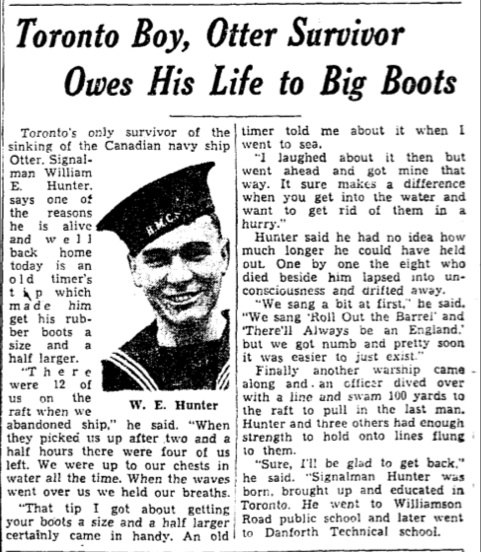 HMCS OTTER - William survived the sinking of HMCS Otter. He was a Sig at the time of her sinking and was listed as living at 14 Williamson Rd., Toronto, ON.