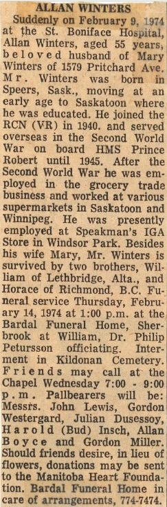 WINTERS, Allan - Suddenly on February 9, 1974 at the St. Boniface Hospital, Allan Winters, aged 55 years, beloved husband of Mary Winters of 1579 Pritchard Ave.  Mr. Winters was born in Speers, Sask., moving at an early age to Saskatoon where he was educated.  He joined the RCNVR in 1940, and served overseas in the Second World War on board HMCS Prince Robert until 1945.  After the Second World War he was employed in the grocery trade business and worked at various supermarkets in Saskatoon and Winnipeg.  He was presently employed at Speakman's IGA Store in Windsor Park.  Besides his wife Mary, Mr. Winters is survived by two brothers, William of Lethbridge, Alta., and Horace of Richmond, B.C.  Funeral service Thursday, February 14, 1974 at 1:00 p.m. at the Bardal Funeral Home, Sherbrook at William, Dr. Philip Petursson officiating.  Interment in Kildonan Cemetery.  Friends may call at the Chapel Wednesday 7:00 - 9:00 p.m.  Pallbearers will be: Messrs. John Lewis, Gordon Westergard, Julian Dusessoy, Harold (Bud) Insch, Allan Boyce and Gordon Miller.  Should friends desire, in lieu of flowers, donations may be sent to the Manitoba Heart Foundation.  Bardal Funeral Home in care of Arrangements, 774-7474 (The Winnipeg Free Press) (click here to view the obituary as published)