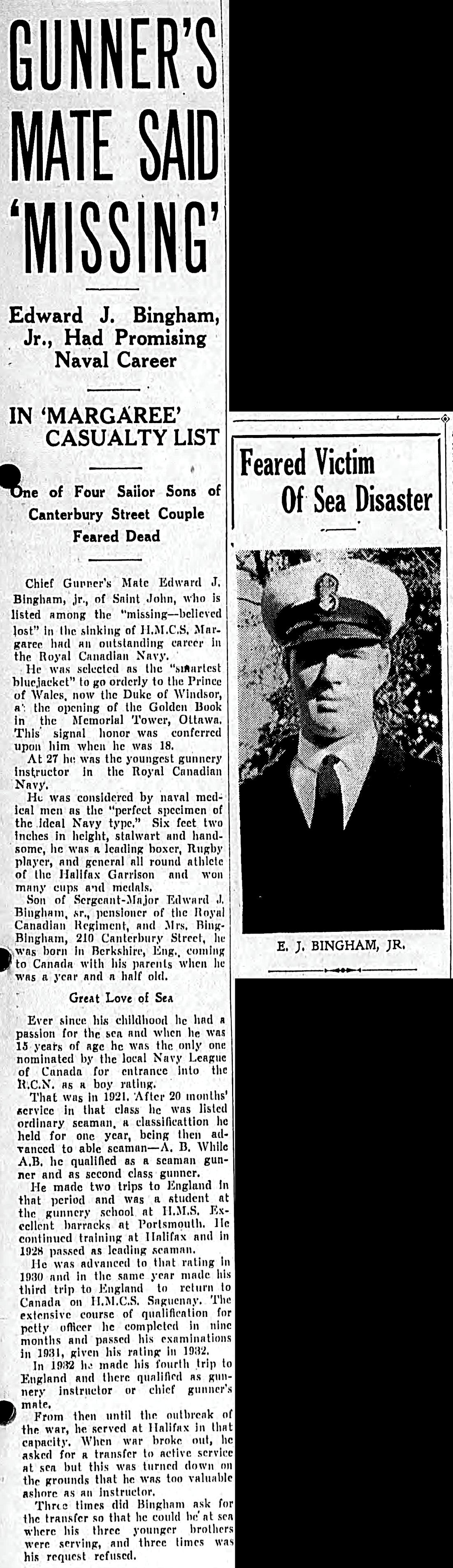 BINGHAM, Edward John Baston, CPO, 1998, RCN, MPK - 22 Oct 1940, HMCS MARGAREE - Son of Edward C. and Emily H. Bingham, of Saint John, NB. Husband of Edna L. Bingham, of Halifax, NS.