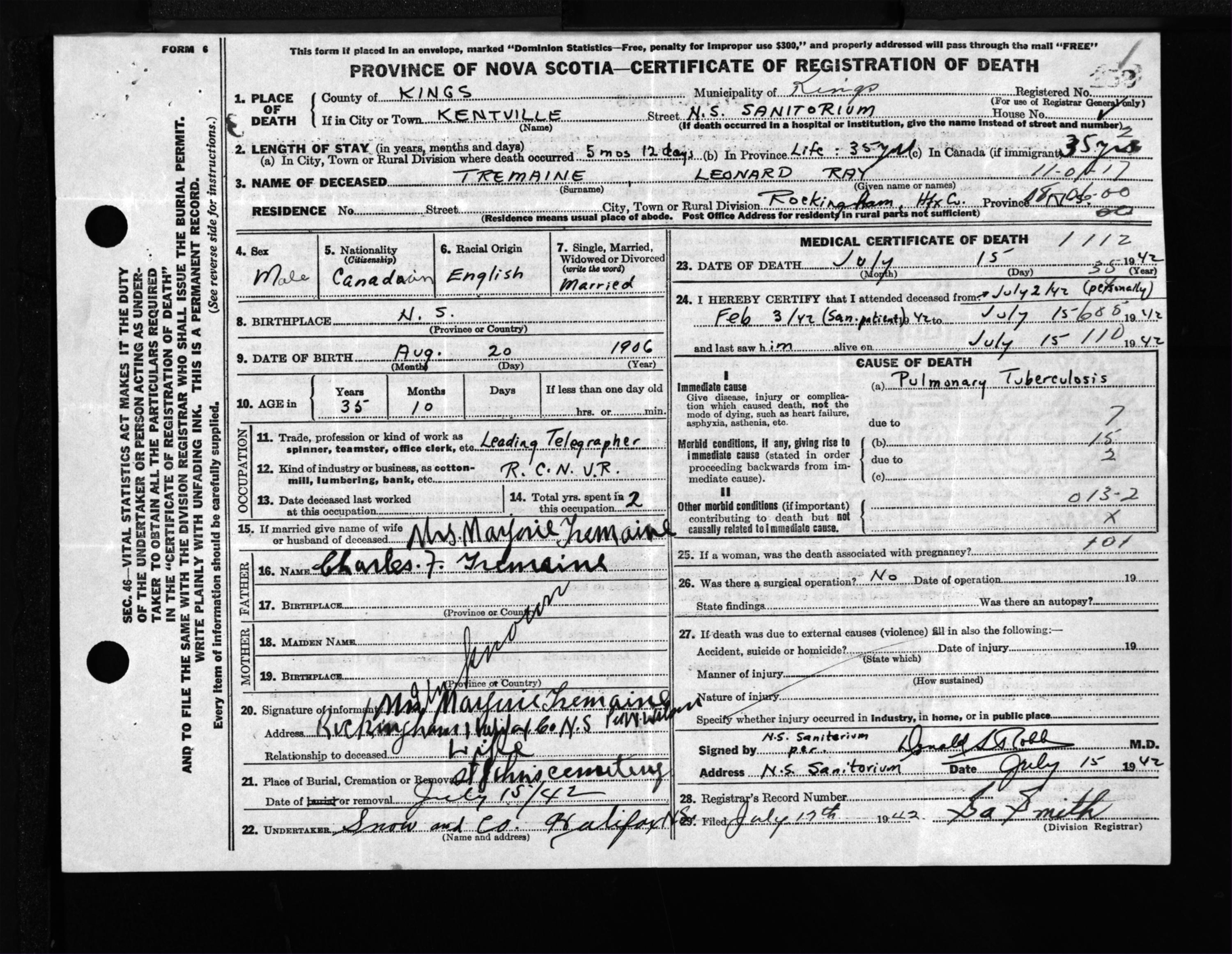 Acting Leading Telegraphist Tremain died in hospital in Kentville, Nova Scotia, from tuberculois that he contracted while serving in HMCS ROSTHERN.
