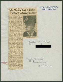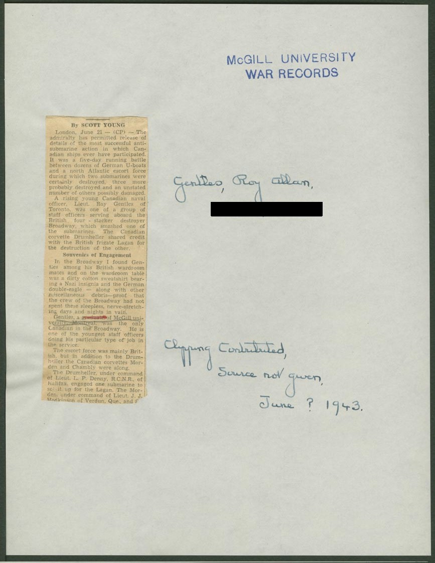 GENTLES, Roy Allan, Lieutenant, Mention in Despatches, RCNVR - Awarded as per Canada Gazette of 13 November 1943 and London Gazette of 7 September 1943