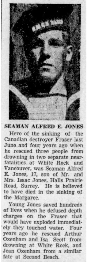 Ordinary Seaman Alfred Ernest Jones was a hero when the Canadian destroyer HMCS Fraser was sunk last June and four years ago when he rescued three people from drowning in two separate near fatalities at White Rock and Vancouver. Ordinary Seaman Jones, age 17, was the son of Mr. and Mrs. Isaac and Lily Jones, of New Westminster, British Columbia. He is believed to have died in the sinking of HMCS Margaree. Young Jones saved hundreds of lives when he defused depth charges on HMCS Fraser that would have exploded had they hit the water. Four years ago he rescued Arthur Oxenham and Lisa Scott from drowning at White Rock and Jean Oxenham from a similar fate at Second Beach.