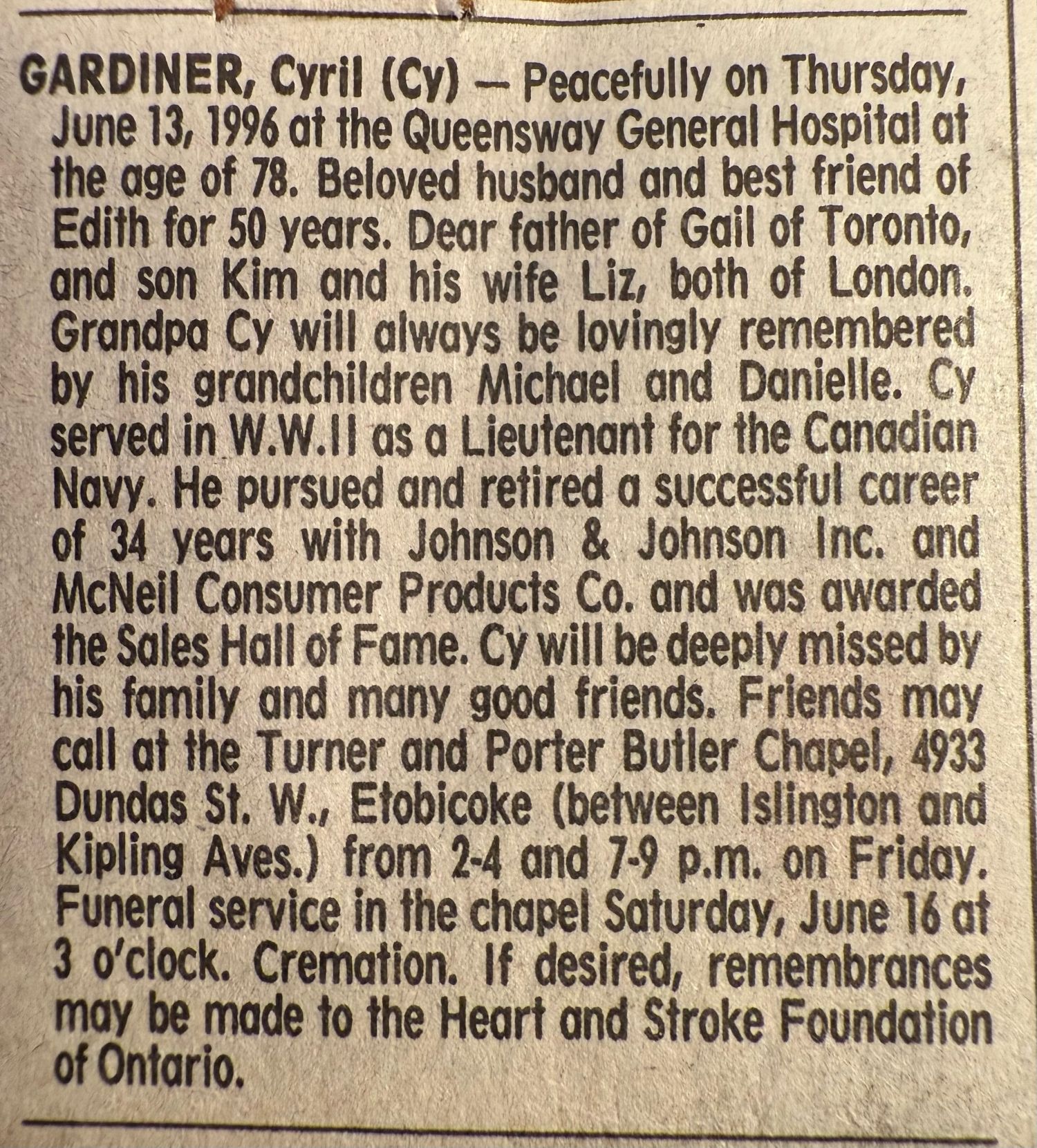 GARDINER, Cyril Herbert (Cy) - Peacefully on Thursday, June 13, 1996 at the Queensway General Hospital at the age of 78. Beloved husband and best friend of Edith for 50 years. Dear father of Gail of Toronto, and son Kim and his wife Liz, both of London. Grandpa Cy will always be lovingly remembered by his grandchildren Michael and Danielle. Cy served in WW II as a Lieutenant for the Canadian Navy. He pursued and retired a successful career of 34 years with Johnson & Johnson Inc. and McNeil Consumer Products Co. and was awarded the Sales Hall of Fame. CV will be deeply missed by his family and many good friends. Friends may call at the Turner and Porter Butler Chapel, 4933 Dundas Ste W., Etobicoke (between Islington and Kipling Ayes.) from 2-4 and 7-9 p.m. on Friday. Funeral service in the chapel Saturday, June 16 at 3 o'clock. Cremation. If desired, remembrances may be made to the Heart and Stroke Foundation of Ontario. (click here to view the obituary as published)