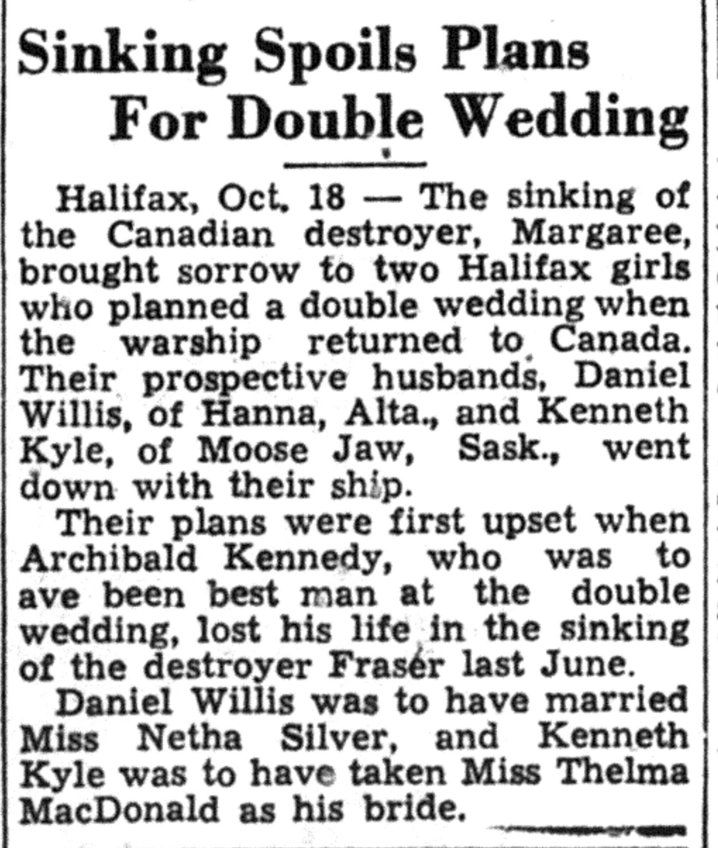 (KHK001) Able Seaman Kenneth Kyle onboard HMCS FRASER // Courtesy of Operation Picture Me (KHK002) AB Kenneth Kyle Lost at sea // Courtesy of Operation Picture Me (KHK003) Sinking Spoils Plans for Double Wedding - Grooms Kenneth Kyle and Daniel Willis lost in the sinking of HMCS MARGAREE. Their intended groomsman, Archibald Kennedy was lost in the sinking of HMCS FRASER // The Toronto Telegram // Courtesy of Operation Picture Me (KHK004) Service file for Kenneth Kyle // Source: The Library and Archives of Canada